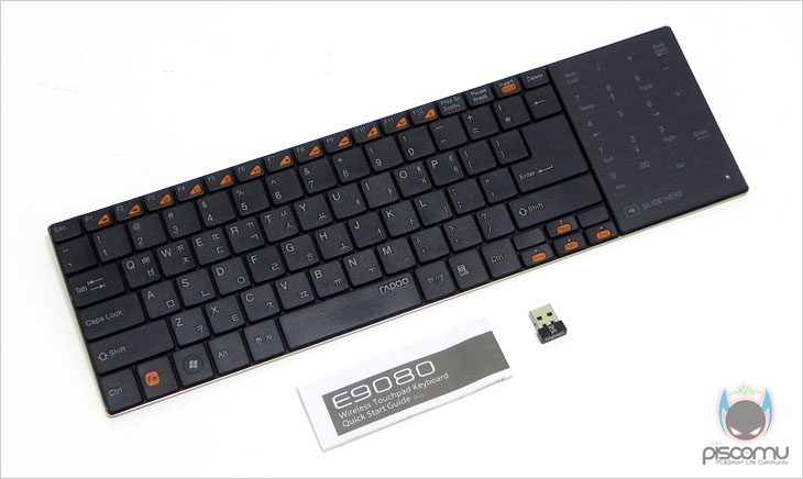 시작에서 말했듯, E9080은 E9070의 상위 모델입니다. 그래서, 제품의 팩키지 형태를 크게 차이 없습니다. 모델명을 비롯해, 무선 주파수와 수신 거리, 나노 리시버를 소개하면서, E9080의 가장 큰 특징인 터치패드를 지원하는 문구를 확인할 수 있습니다. 이와 동시에 내부에 포장된 제품을 일부 노출시켜 보여주는데, 핵심인 터치패드를 간접적으로 확인할 수 있겠습니다. 박스 후면에는 제품에 대해 좀 더 자세히 소개를 해주고 있는데, 5.6mm의 슬림한 두께와 터치패드와 숫자패드 겸용 지원, 그리고, 무선 지원과 플러그앤플레이 방식 지원을 소개하면서 터치패드의 작동법 역시 간단히 소개를 하고 있겠습니다. 제품 구성은 키보드를 비롯해, 설명서, 수신 리시버로 역시 이전 만난 E9070과 차이가 없겠습니다.