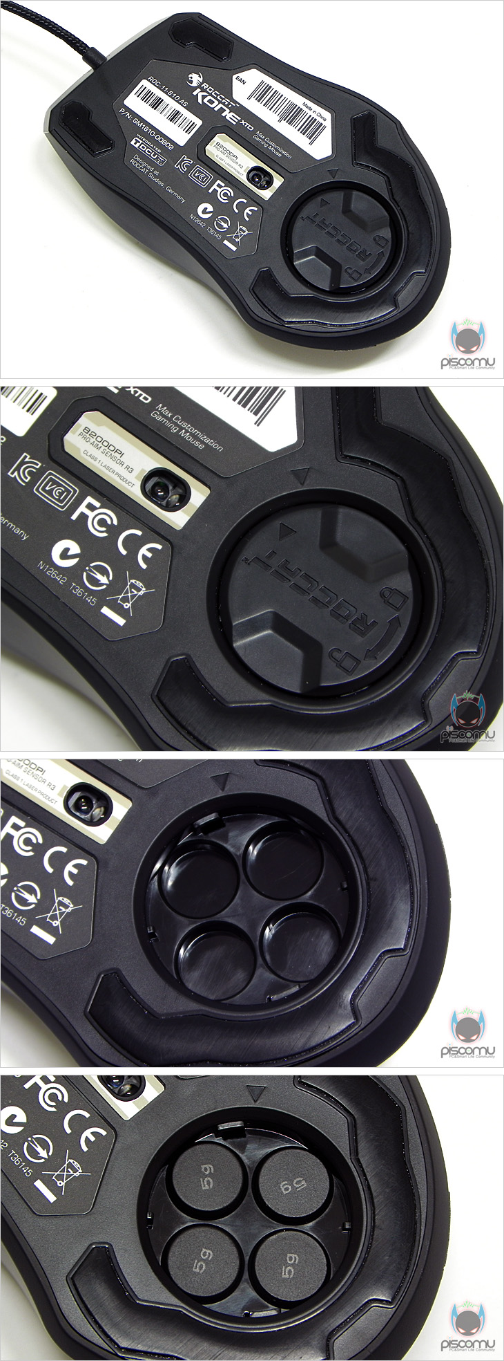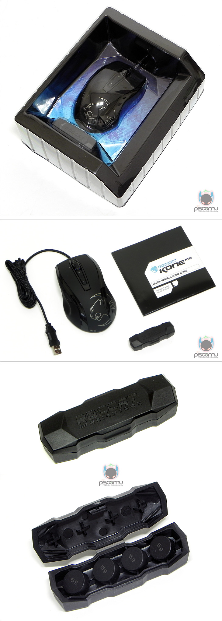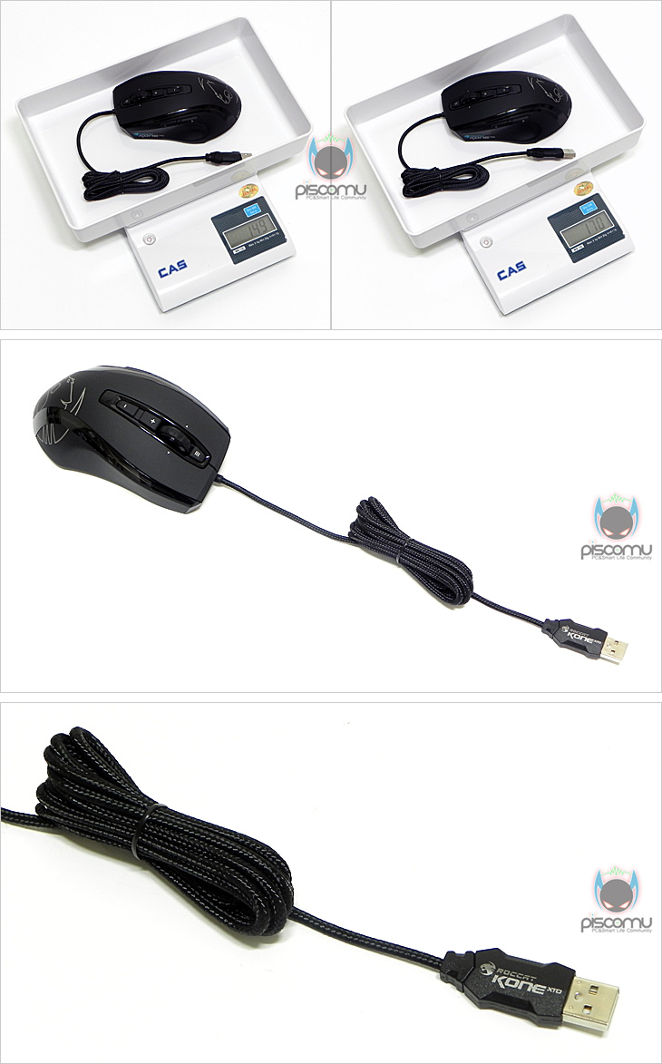 Kone XTD를 살펴보면, 전체적인 외형 디자인은 기존 Kone[+]를 그대로 따르고 있습니다. 즉, Kone[+]기준에서 볼 때는 내부 하드웨어부분이 업그레이드된 모델 Kone XTD입니다. 전체적인 색상은 블랙(black)입니다. 디자인형태는 좌우비대칭으로 오른손 전용으로 지원되며, 양쪽 라인형태의 유광 처리된 부분은 기존 Kone[+]와 마찬가지로 멀티 4색 LED 효과를 주는 부분으로 사용자가 제공되는 전용 프로그램을 통해 원하는데로 변경할 수 있겠습니다. Kone시리즈 최상위에서만 적용되는 부분이기도 하겠습니다. 그리고, 그립 뒷부분에는 제조사 로고가 새겨져 있으며, 앞부분 버튼부분에는 기존 좌우버튼을 비롯해, 가운데 휠-버튼이 자리잡고 있는데, 휠-버튼은 고무재질 적용과 함께 총 24개 홈 처리의 톱니바퀴 모양 처리로 정확도 있는 스크롤과 접지력을 높였습니다. 또한, 휠-버튼은 스크롤과 클릭 외에 좌우 틸트 기능을 함께 가지고 있겠습니다. 그리고, 훨-버튼 앞부분에는 기본 운영체제의 ‘내컴퓨터’ 실행창을 띄워주는 버튼이 배치되어 있으며, 뒷부분에는 DPI값을 변경할 수 있는 DPI Up/Down 버튼이 배치되어 있겠습니다. 그리고, 마우스 전면에서 보면 왼쪽으로 기울어진 전체 모양을 확인할 수 있는데, 이 역시 오른손에 최적의 그립감을 주기 위한 설계라 할 수 있겠습니다. 참고로, 좌우 기본 버튼 스위치는 옴론(Omron)으로 앞선 만난 Kone Pure와 동일하겠습니다. 마우스 측면 역시 그립감을 높이기 위해 그립시 엄지와 새끼손가락 위치부분에 홈처리를 했으며, 좌측 경우엔 기본 웹-브라우저 앞/뒤 기능 버튼을 배치해놨습니다. 그리고, 앞부분에는 모델명을 새겨놨습니다. 마우스 밑면을 살펴보면, 부드러운 움직임을 위해 앞뒤부분에 테프론 피트를 기본 부착해놨으며, 가운데 레이저 센서 배치로 레이저 센서 역시 앞서 만난 Kone Pure와 동일한 Pro-Aim R3 센서로 칩은 Avago사의 ADNS-9800으로 역시 DPI는 200~8200DPI 범위로 지원해주겠습니다. 그리고, 뒷부분에는 무게추를 적용할 수 있는 수납공간으로 총 4개 모두 수납이 가능해 사용자가 원하는 무게를 조절할 수 있겠습니다. 조금 아쉬운 점이라면, 기존 Kone[+]에서 그랬듯이 수납커버를 여는 방법이 별도의 장치 없이 돌리는 방식인데, 조금 번거로운 편이라는 점을 지적할 수 있겠습니다. 마우스 무게는 오차 1g정도를 포함해, 무게추를 사용하기 전 기본 무게는 149g이며, 개당 5g의 무게추를 4개 모두 사용했을 경우엔 약 170g으로 측정되는 것을 확인할 수 있겠습니다. 끝으로, 케이블 길이는 1.8m가 되겠으며, 케이블 전체 깔끔하게 슬리빙 처리를 했으며, 연결 인터페이스는 USB 방식으로 전송제어 속도(Polling Rate) 최대 1000Hz까지 지원해주겠습니다.