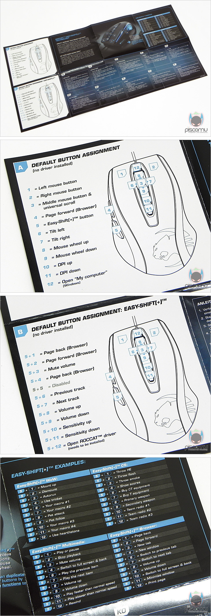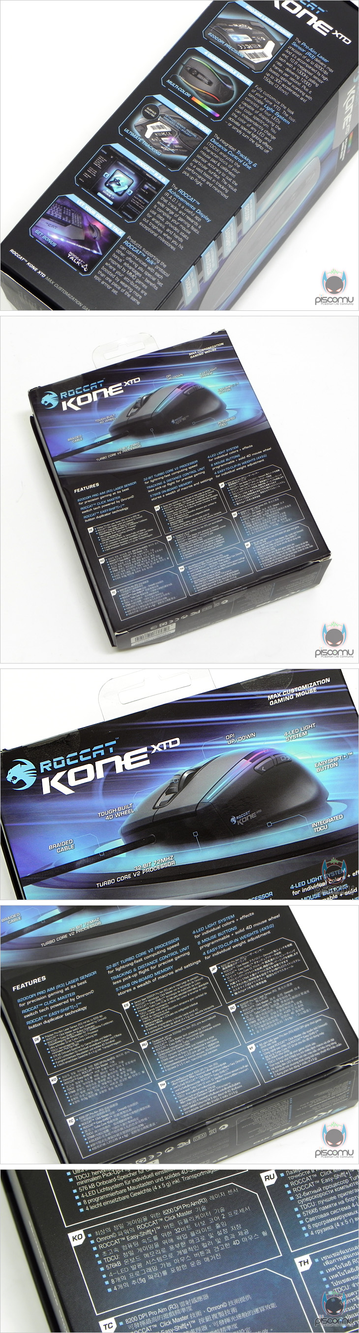 Kone XTD의 제품 포장은 예전 모델이나 최근 만난 Kone Pure와 비슷한 형태입니다. 제품 이미지 삽입과 함께 역시 모델명과 컬러 LED 지원을 바로 확인할 수 있으며, 업그레이드 된 8200DPI와 ROCCAT의 특징 Esay-Shift 지원, 멀티 컬러, 트래킹 기술까지 앞선 Kone Pure와 업그이드 된 기술 지원은 동일한 것을 짐작할 수 있습니다. 이 밖에, 매크로 지원, 576KB 온보드 메모리 지원, 무게추 지원, 새로운 Pro-Aim R3 센서 지원도 추가로 확인할 수 있습니다. Kone XTD 역시 전면 커버 오픈 형태를 가지고 있는데, 커버를 열면 내부에 포장된 마우스를 비롯해 커버 안쪽에는 제품의 특징을 소개하고 있겠습니다. 그리고, 박스 측면과 후면에도 역시 제품에 관한 특징을 자세히 소개하고 있어, 좀 더 추가적인 제품 특징을 확인할 수 있으며, 총 9개국 언어로도 소개하고 있는데, 기존 제품들에서 꾸준히 그랬듯이 한국어 역시 기본 포함이 되어있습니다. 제품 포장은 마우스 크기에 맞춘 캡(CAP)방식을 적용했으며, 제품 구성은 마우스를 비롯해, 설명서와 무게추가 담긴 보관함으로 이루어져 있습니다. 무게추는 Kone[+]와 마찬가지로 개당 5g으로 총 4개를 지원해주겠습니다. 제품 설명서에는 제품 기본 설명 외에 기본 마우스 버튼 기능과 ROCCAT의 특허 기술인 버튼 조합에 의한 추가 기능 지원 Easy-Shift의 기본 기능에 대해 알려주고 있으며, 게임이나 멀티미디어, 웹브라우저 별 예정 기능도 함께 안내해주겠습니다.