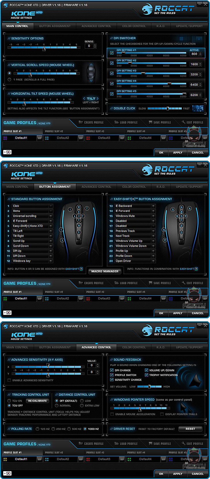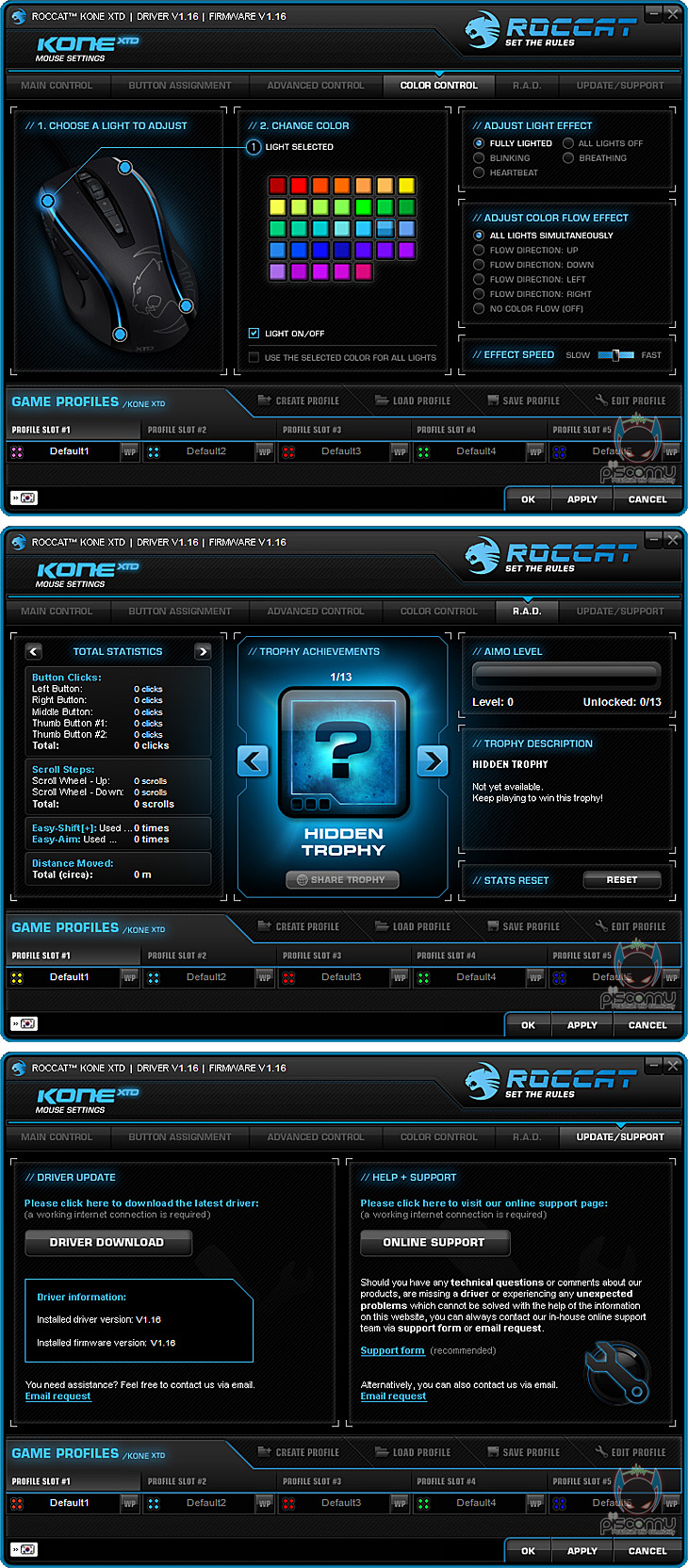 직접, Kone XTD를 사용해보았습니다. 별도의 드라이버 설치없이 바로 USB 인터페이스를 연결하면 사용이 가능하겠습니다. 또한, 연결과 동시에 바로 라인을 따라 LED 라이트 효과를 볼 수 있는데, 기본상태는 단색으로 작동되지만, 후에 확인할 제공되는 프로그램을 통해서 Kone[+]와 마찬가지로 총 4개곳의 LED색상을 사용자가 원하는대로 변경해 적용할 수 있겠습니다. 그리고, 기본 그립감은 커버 전체 표면을 우레탄코팅으로 처리해서 부드러운 편이며, 필자의 손 길이가 약 19cm이점에서 볼 때 편안한 편이였습니다. 반대로 생각하면, 마우스 길이가 좀 있기 때문에 손이 작은 사용자입장에선 마우스가 크다라고 느낄 수 있겠습니다. 마우드 패드 재질별로 Kone XTD 작동 유무를 확인해 보았습니다. 패브릭, 알루미늄, 특수 PCB처리의 패드에서 모두 사용해 본 결과, 정상적인 움직임을 확인할 수 있으며, 역시 패드에 따라 슬라이딩과 브레이킹은 영향을 많이 받기 때문에, 사용자가 슬라이딩 위주라면 매끄러운 표면처리가 된 패드를, 브레이킹 위주라면 거친 표면의 패드를 선택해야하겠습니다. 이번엔 마우스 위주의 게임에서 Kone XTD를 사용해 보았습니다. 버튼 클릭 압력은 가볍지도 무겁지도 않은 중간 정도로 손 크기에 따라 피로도 차이가 좀 있을 것으로 생각됩니다. 기본적으론 무난합니다. 휠-버튼은 다른 제품에 비해 좀 더 큰 편이고, 홈 처리에 의해 스크롤시 구간느낌을 확실하게 전달해줍니다. DPI는 프로그램을 통해서 최소200부터 최대 8200DPI까지 200단위로 조절이 가능하고, 이를 프로파일로 최대 5개까지 지정할 수 있기 때문에 사용자 취향과 게임 취햐야에 맞춰 설정하는 것이 유용하겠습니다. 그립에 의한 땀 발생은 비교적 적은 편입니다. 역시 표면 특수코팅 처리에 의한 영향이라 볼 수 있겠습니다. 끝으로, Kone XTD 역시 전용프로그램을 제공해주는데, 프로그램 인터페이스나 메뉴는 앞서 만난 Kone Pure와 큰 차이가 없겠습니다. 단지, 기본 버튼 개수 차이가 있어 버튼 설정을 해주는 Button Assignment에 설정부분이 더 많아졌습니다. 이 외에, 감도, 틸트, 스크롤, DPI 설정의 Main Control과 X/Y 축 감도, 트래킹 기술, 피드백 사운드, 포인트 스피드의 Advanced Control은 크게 차이가 없겠습니다. LED 라이트를 설정할 수 있는 Color Control에는 Kone Pure보다 전체 컬러 지원 수는 적지만, 단색 지원은 총 33개로 많으며, 양쪽 라인 앞뒤부분에 각각 설정으로 4곳에 색상 설정이 가능하겠습니다. 그리고, 효과 지원 역시 총 5가지로 라이트 Off, 풀-라이트, 즉시 깜빡임의 Blinking, 순차 깜빡임(일반 펄스)의 Breathing, 켜진 상태에서의 색변경 Heartbeat 로 지원되겠습니다. 이 밖에 Kone XTD를 사용하는 동안의 기록을 체크해주는 R.A.D와 쉽게 최신 버전으로 드라이버 및 펌웨어를 업데이트 해주는 메뉴까지 확인할 수 있겠습니다.