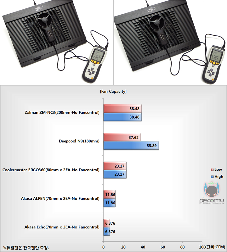 직접, N9을 사용해보았습니다. 일단, 제품자체만 작동시켜 팬의 풍량과 소음을 측정해보았습니다. 팬 컨트롤러가 지원되기 때문에 최저 속도와 최대 속도에서 각각 측정을 했으며, 각도는 6단계 중 중간 단계 높이에서 조절했습니다. 노트북쿨러는 각도에 따라 풍량과 소음의 차이가 있음을 참고하기 바랍니다. 측정 결과, 먼저 풍량은 180mm 대형팬답게 저속과 고속 모두에서 높은 양을 보여줬습니다. 특히, 고속에서 상당히 많은 량을 보여줘서 쿨링에 대한 효과가 클 것으로 생각됩니다. 소음은 측정 결과, 저속 경우엔 약 41dB(A)로 다른 쿨러들과 비슷한 수치로 소음기준에서 볼 때 정숙한 편이며, 고속인 경우엔 약 50dB(A)로 약간 소음이 발생하는 수준입니다. 하지만, 앞서 풍량을 생각했을 때, 소음은 풍량과 어느정도 비례한 수준이라 할 수 있겠습니다. 끝으로, 실제 노트북을 올려서 사용해 보았습니다. 노트북은 15.6인치가 되겠습니다. PCMark Vantage를 실행해 노트북 내부의 프로세서, 그래픽, HDD의 주요 온도에 따른 최대 온도값을 확인해 본 결과, 팬을 사용하지 않았을 때와, 저속, 고속일 때의 온도 차이를 확연히 확인할 수 있겠습니다. 따라서, 노트북에 따라 온도차이를 다 다르겠지만, N9을 통해서 분명히 쿨링에 대한 효과를 가질 수 있음을 알 수 있겠습니다.