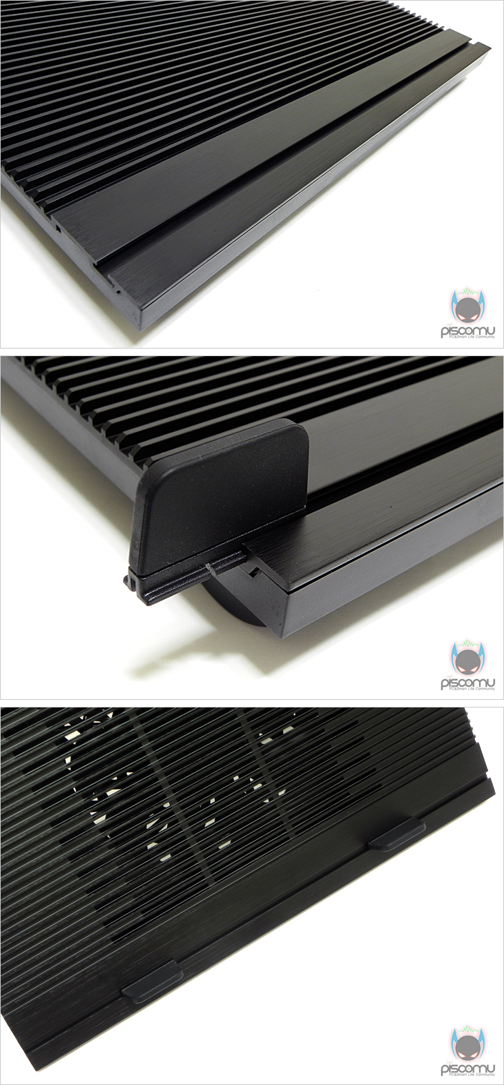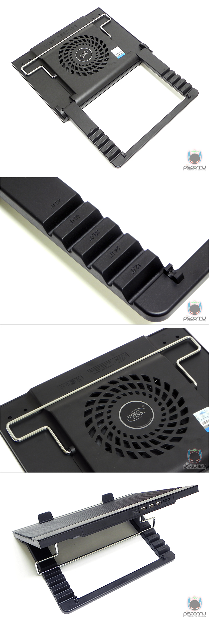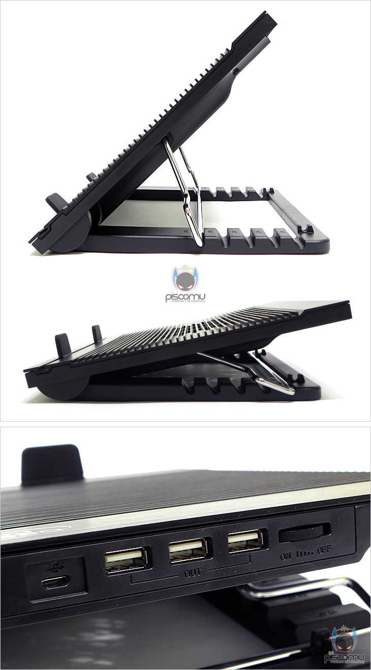 N9을 살펴보겠습니다. 전면 패널은 전체 알루미늄 재질 적용으로 자체적인 쿨링효과를 가질 수 있게 해줬으며, 패널 색상에 따라 제품은 블랙과 실버로 나뉘어지겠습니다. 제일 상위에는 제조사명이 새겨져 있으며, 알루미늄 표면에는 헤어라인처리로 고급스러운 느낌을 주겠습니다. 그리고, 중앙에 처리된 세로 홈 라인은 V.A.D(Vertical Airflow Design)으로 내부 중앙에 대형 180mm 팬을 통해 좌우로 열이 신속하게 좌우로 빠지고 외부 공기가 들어오는 효과를 가지겠습니다. 패널 맨 아래는 세로로 길게 처리된 홈을 확인할 수 있는데, 앞서 부속품에서 본 노트북 지지대를 여기에 끼워 노트북 크기에 따라 좌우 조절을 통해 받침 역할을 해주겠습니다. 이번엔 쿨러 밑면을 살펴보는데, 밑면 중앙에는 내부에 장착된 180mm 팬에 외부 공기 유입전달을 위해 에어홀 처리가 되어있으며, 양쪽 받침대 부분에는 미끄럼방지를 위해 기본 고무 패드를 부착해놨습니다. 밑면 받침대를 좀 더 살펴보면, 받침대를 펼치면 양쪽에 각각 6개의 홈처리를 확인할 수 있는데, 각 홈에는 각도를 표기해놨으며, 총 6단계의 각도조절이 가능하겠습니다. 사용법은 간단하게 철재 지지대를 홈에 끼우면 되겠습니다. 각도는 최소 12°부터 최대 45°까지 조절이 가능하겠으며, 측면에서 보면 쉽게 각도 조절 구분을 확인할 수 있겠습니다. 그리고, 전면에는 전원포트를 비롯해 3개의 USB 2.0(1.1) 포트가 배치되어있으며, 맨 오른쪽에는 팬 속도를 조절할 수 있는데, 컨트롤러가 배치되어 있겠습니다. 팬 속도는 600~1000RPM 범위를 가졌습니다.