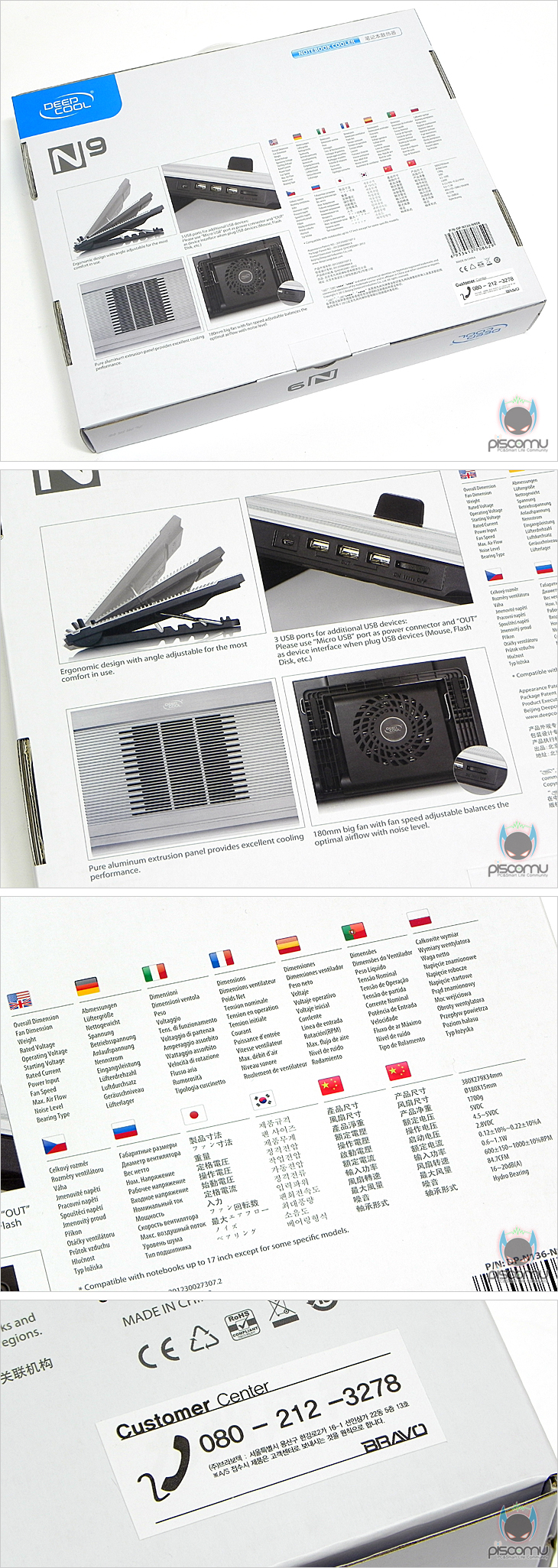 N9은 앞서 잠깐 언급했듯이, 노트북 17인치까지 지원해주는 제품으로 보통 17인치까지 지원이면 거의 모든 노트북 제품들은 사용이 가능하겠습니다. 제품 박스를 통해서 최대 인치 지원 외에도, 패널 풀-알루미늄 적용, 각도조절, 180mm 팬, 팬 속도조절, 3개의 USB 포트지원, 저소음 지원을 제품 특징으로 확인할 수 있겠습니다. 그리고, 이동시 편리를 위해 손잡이 처리를 해놨습니다. 박스 후면은 통해서는 제품의 특징 소개와 기본 제품 스펙 정보를 확인할 수 있는데, 스펙 정보는 총 13개국 언어로 표기를 해놨습니다. 그리고, 국내는 정식수입원인 ㈜브라보텍에서 맡으며 1년의 제품 보증기간을 받을 수 있겠습니다. 제품 포장은 일반 노트북쿨러들과 마찬가지로 양쪽 스티로폼을 끼운 형태이며, 제품 구성은 쿨러를 비롯해, 설명서, 노트북 받침지지대, 그리고 USB형 전원케이블로 이루어져 있습니다.