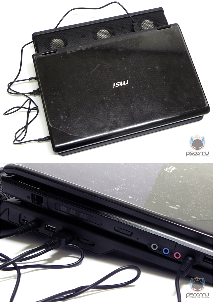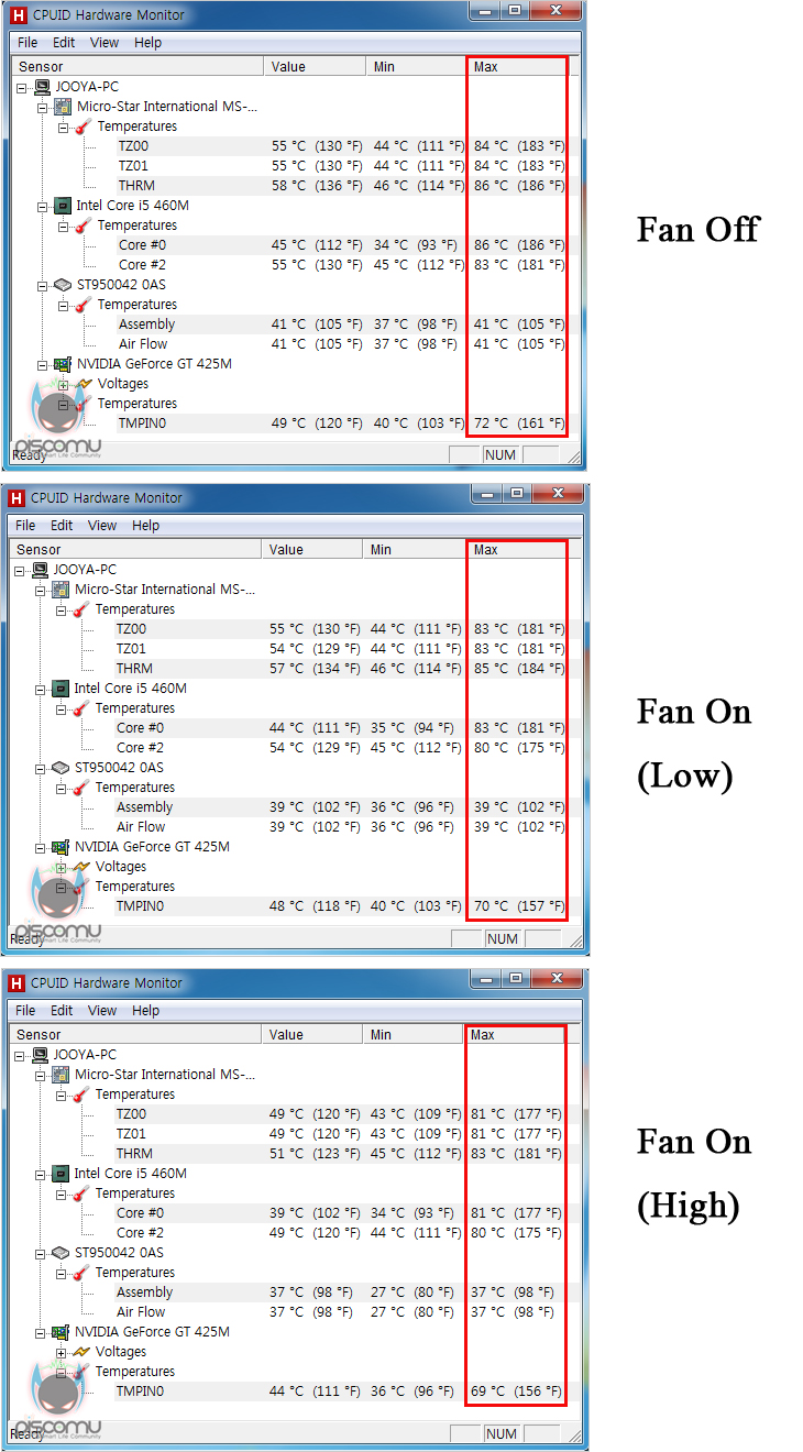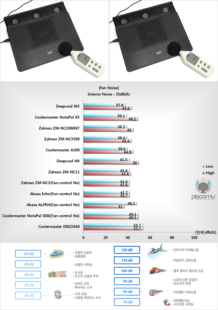 M3를 직접 사용해 보았습니다. 일단, 쿨러자체만 작동시켜 순수하게 팬 풍량과 팬 소음을 측정해 보았습니다. 팬 컨트롤러가 지원되기 때문에 저속과 고속에서 측정 진행을 했으며, 먼저 풍량의 경우는 140mm팬의 다른 모델에 비해 조금 풍량이 작은 것을 확인할 수 있습니다. 이는 M3가 별도의 각도 조절이 없고, 제품 형태 자체가 경사도로 만들어진 형태이기 때문에 밑면에서 유입되는 공기 양이 적기 때문이겠습니다. 하지만, 쿨링에는 충분히 효과를 주는 풍량이 되겠습니다. 소음은 앞서 풍량에 비례하듯, 저속과 고속상태 모두에서 정숙한 소음치를 보여줬으며, 특히 저속에서는 정숙보다 확실히 저소음에 가까운 소음대를 보여주고 있어 소음에 민감한 소비자에겐 매리트가 있는 부분이라 할 수 있겠습니다. 이번엔, 직접 노트북을 올려 사용해보았는데, 최대 크기 15.6인치 지원으로 15.6인치 노트북을 사용했으며, 오디오 연결은 제공되는 오디오 잭을 쿨러 오디오 포트와 노트북 헤드셋(스피커) 포트에 연결하면 바로 사용이 가능하겠습니다. 물론, USB 케이블이 전원 역할을 해주기 때문에 기본적으로 연결이 되어 있어야 하겠습니다. 사운드 출력은 노트북에 따라 체감이 다르겠지만, 전달 출력은 무난하며, 음질도 좋은 편입니다. 특히, 노트북 스피커의 출력 한계를 해결하고 싶다면, 연결해서 사용하는 것이 좋을 것으로 생각됩니다. 쿨링 효과 역시 팬 사용 유무와 팬 컨트롤러에 따른 효과 차이를 보여주는 것을 확인할 수 있는데, PCMark Vantage를 실행하는 동안 노트북 내부의 CPU와 그래픽, HDD 등의 주요 부품 최대 온도치를 비교해 본 결과, 저소음 팬으로 노트북 모델에 따라 쿨링효과 차이가 다를 수 있지만, 팬을 사용하지 않을 때와 팬이 저속과 고속일 때 온도차이를 분명하게 보여주는 것을 확인할 수 있겠습니다.