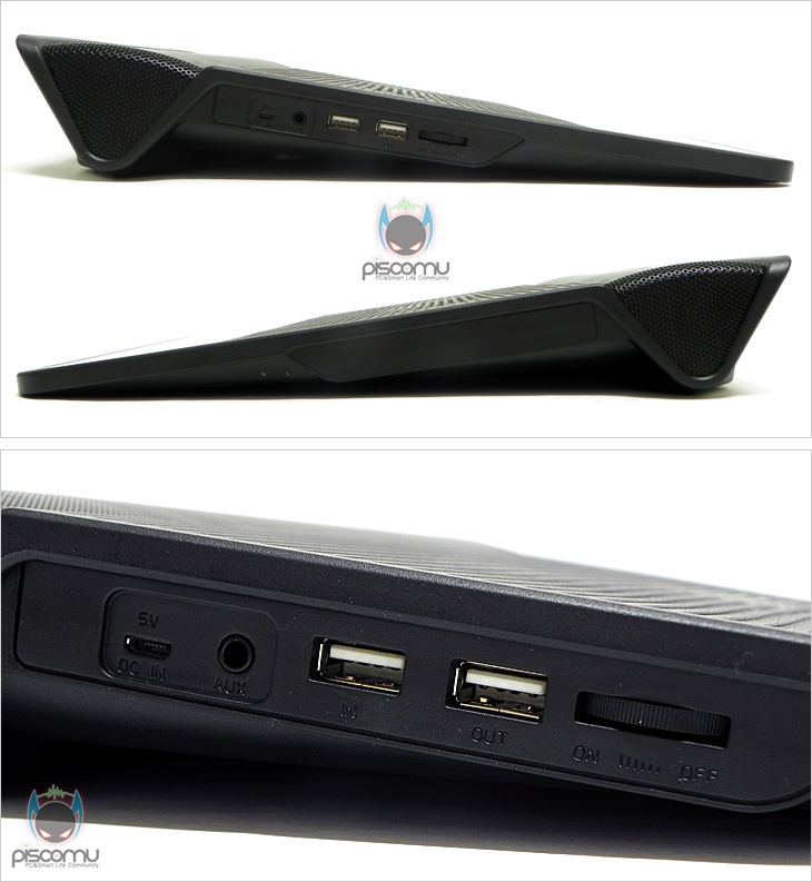 M3를 살펴보면, 블랙모델 경우 전체 색상이 블랙이며, 나머지 색상들은 흰색 바탕에 맨 위에 배치된 스피커부분의 외부 메쉬부분의 색상에 따라 구분이 되겠습니다. 맨 위에 배치된 스피커에는 가운데 우퍼를 중심으로 양쪽에 서브 유닛 구조로 2.1채널 구성을 하고 있겠습니다. 노트북 쿨러에서 2.1채널 스피커를 지원하는 모델은 M3를 포함해 딱 모델밖에 없겠습니다. 중앙에는 앞서 만난 자사의 N9과 비슷한 세로 라인 홈처리와 함께 중심부에 내부 팬 풍량의 영향을 받아 쿨링되도록 에어홀 처리가 되어 있으며, 하단은 알루미늄 재질로 적용되어 헤어라인 효과와 함께 가운데 제조사명이 새겨져 있겠습니다. 참고로 내부의 팬 크기는 140mm가 되겠습니다. 쿨러 측면을 살펴보면, 앞부분은 V자형태로 처리되어 자연스럽게 전체 경사도를 만들어냈으며, 좌측에는 오디오 포트를 비롯해 2개의 USB 포트와 팬 속도를 조절할 수 있는 팬 컨트롤러가 배치되어 있겠습니다. 끝으로, 쿨러 밑면을 살펴보면, 가운데는 내부 팬에 외부 공기 유입이 전달될 수 있도록 에어홀 처리가 되어 있으며, 앞부분와 뒷부분 각 모서리 부근에는 사용시 미끄럼방지를 위해 고무패드를 기본 부착해놨습니다.