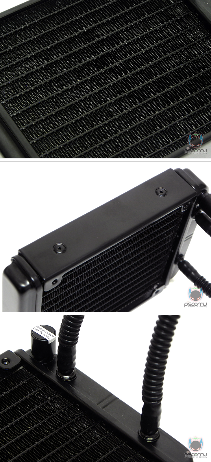 Seidon 120M을 살펴보면, 먼저 라디에이터 경우 150x118mm 가졌으며, 일반적인 120mm 팬 크기에 맞춘 크기를 가졌습니다. 또한, 기본적으로 팬이 1개 제공되지만, 앞뒤 방향으로 모두 장착 지원을 해주고 있어 최대 듀얼 팬 구성이 가능하겠습니다. 라디에이터 중심부는 촘촘하게 처리된 알루미늄 배열을 확인할 수 있는데, 신속하게 열이 처리되기 위함이 되겠습니다. 그리고, 라디에이터 두께는 27mm를 가졌고, 튜브(호스)와 연결되는 연결부는 누수방지를 위해 패킹 처리를 한 번 더 적용해 깔끔하게 처리되었습니다. 튜브(호스)의 총 길이는 약 300mm이며, 튜브(호스) 모양은 일반적인 굴곡 있는 호스모양을 하고 있겠습니다. 그리고, 워버블록으로 넘어와서 워터블록에 연결된 전원 커넥터는 3핀을 지원하고 있겠습니다. 전원 케이블 역시 깔끔하게 슬리빙 처리되어 있겠습니다.