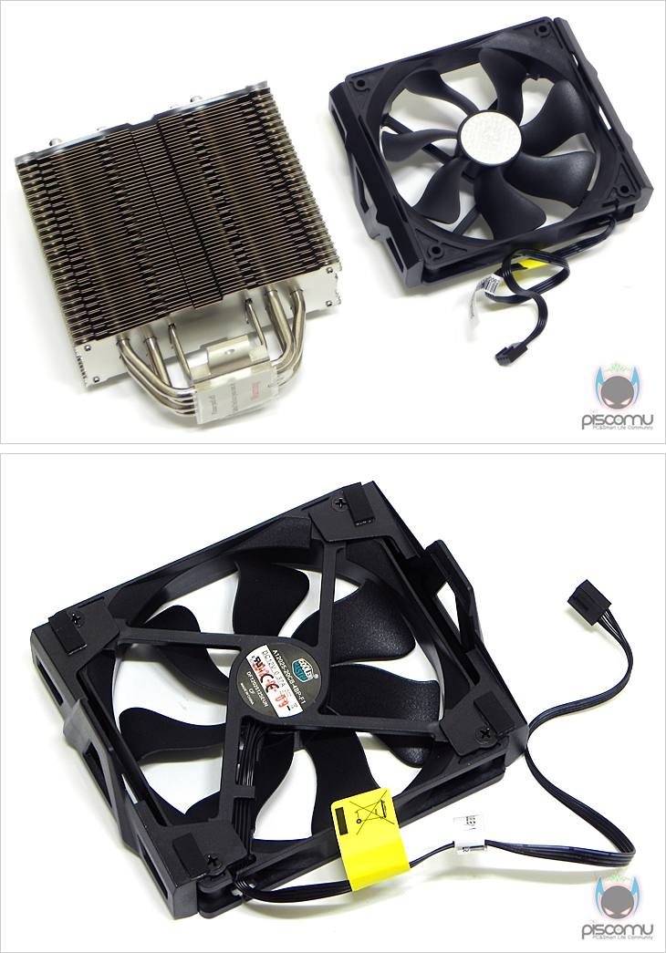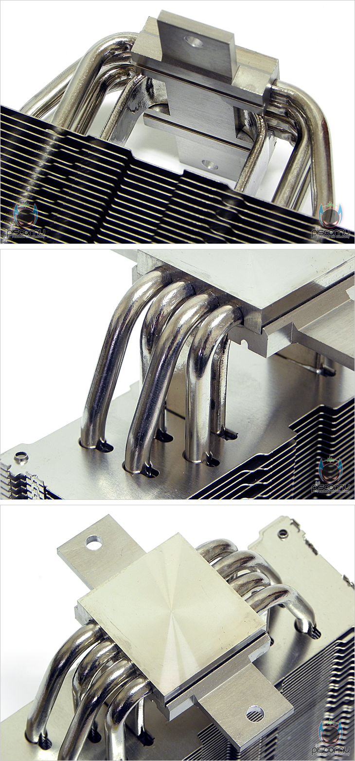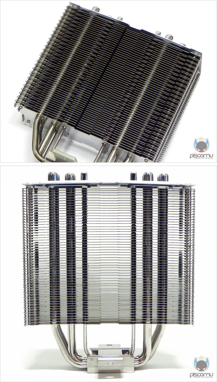 방열핀의 디자인은 TPC812와 동일하지만, 총 개수 지원헤서 10개정도 늘어난 54개를 적용했습니다. 전면에서 보면, U자형 구조 히트파이프와 수직 증기 챔버가 방열핀을 통과하는 것을 확인할 수 있겠습니다. 그리고, 하단부에 4개의 히트파이프가 적용된 것을 확인할 수 있으며, 히트파이프 안쪽에 수직형 증기 챔버가 배치되니 것을 확인할 수 있겠으며, 둘 다 니켈 도금처리를 통해 깔끔한 상태를 가졌습니다. 그리고, CPU와 맞닿는 베이스부분은 깔끔하게 잘 래핑처리 되어 있겠습니다.