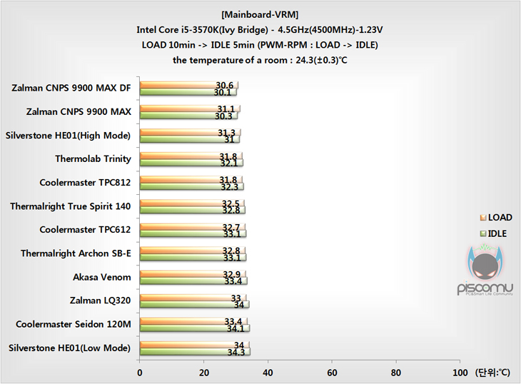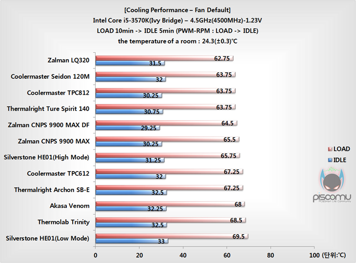이제, TPC612의 성능을 확인해 보겠습니다. 시스템 기반은 인텔(Intel)이며 프로세서는 아이비브릿지 i5-3570K로 타워형 쿨러인 점과 퍼포먼스급 제품인 점을 고려해 바로, 오버클럭(4.5GHz) 상황에서 진행이 되었으며, 순수 쿨러의 팬 소음과 풍량만을 측정하기 위해 파워서플라이와 그래픽카드는 팬이 없는 팬리스(Fanless)로 구성했습니다.