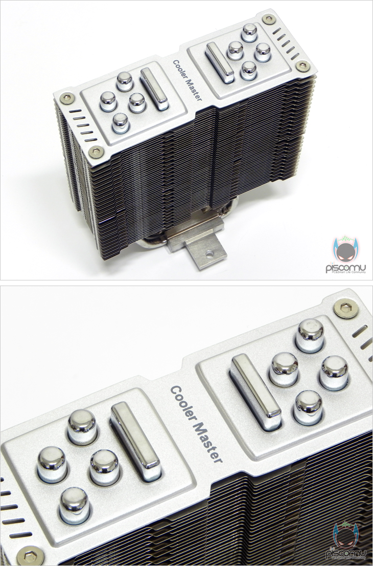 팬은 분리해 좀 더 쿨러를 살펴보는데, 일단 팬을 분리하면 내부에는 기본적으로 팬 소음진동을 최소화 하기 위해 방진패드가 부착되어 있겠습니다. 만약 추가 팬을 장착한다면, 앞서 부속품에서 추가로 제공해주는 브라켓과 스크류, 방진패드를 사용하면 되겠습니다. 쿨러는 살펴보면, 가장 상위 방열핀에는 가운데 제조사명이 새겨져 있으며, 양쪽에는 히트파이프와 수직형 증기 챔버의 마감처리를 해놨습니다. TPC812와는 동일한데, 히트파이프에서 2개가 빠진 형태가 되겠습니다.