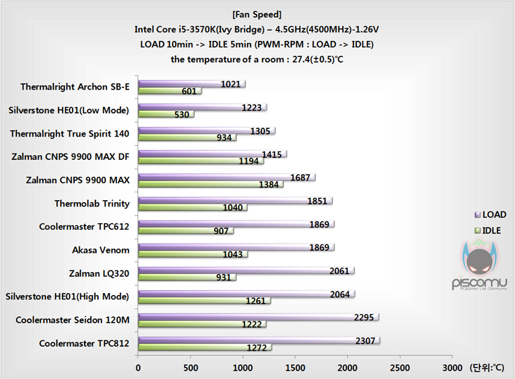 다음은 전원부에 전달되는 쿨링의 영향을 확인해 보는데, 간접적으로 전달되는 전원부 쿨링영향은 확인 결과, 앞서 프로세서의 성능과 비슷한 성능급으로 보여줬습니다. TPC812보다는 조금 낮지만, 그래도 전원부에 주는 쿨링영향이 다소 높은 편임을 확인할 수 있겠습니다. 이번엔 진행동안의 팬 속도를 확인해 보는데, 기본 제공되는 팬의 범위가 600~2000RPM으로 비교적 넓은 폭을 가졌으며, LOAD에선 최대 RPM보다는 조금 낮은 수치로, IDLE에선 최소 RPM보다는 300RPM정도 높은 값으로 작동되었습니다. 작동방식은 PWM방식이기 때문에, 사용자의 시스템 환경에 따라 다르게 작동할 수 있겠습니다. 하지만, 전반적으로 팬 속도 역시도 중간 정도라 할 수 있겠습니다.