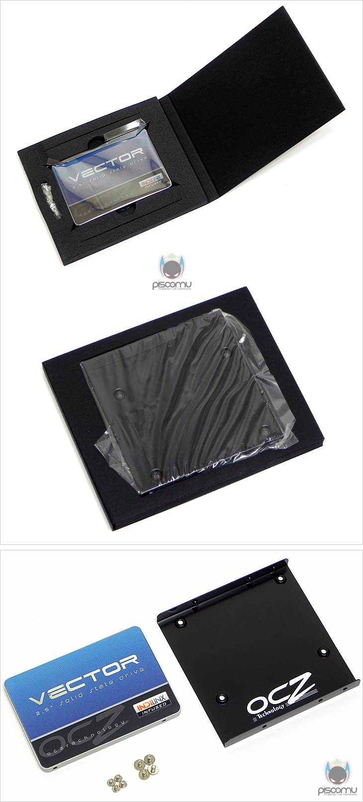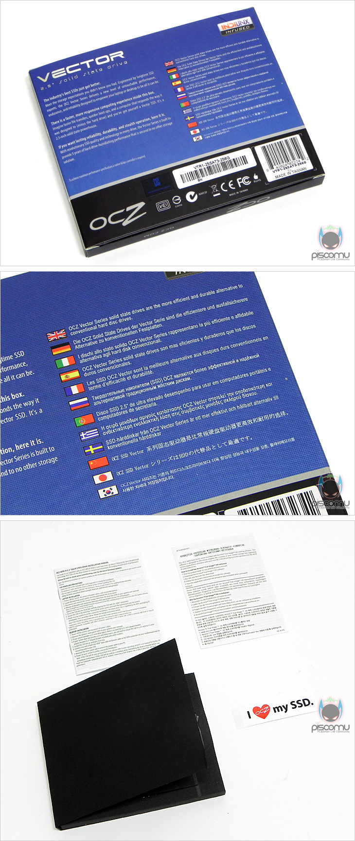 Vector 시리즈의 제품 팩키지(Package) 형태부터 살펴보면, 제품 박스를 판매 제품의 신뢰도를 위해 전체 밀봉 포장상태를 초기에 가지고 있습니다. 소비자 입장에선 온/오프라인 어떤 경로로 제품을 구입하더라도 판매 제품에 대한 신뢰감을 가질 수 있겠습니다. 제품 박스에는 해당 제품의 형태 이미지를 담고 있어 개봉 전 쉽게 디자인 파악을 할 수 있으며, 제품 디자인에 맞춰 박스 디자인이 적용된 것을 알 수 있겠습니다. 또한, 모델명과 해당 제품의 컨트롤러칩인 인디링스(Indilinx) 적용을 비롯해, S-ATA 인터페이스 지원, 플래시 메모리 형태, TRIM 지원, 3.5인치 어댑터, 소프트웨어 제공, 해당 모델의 용량도 확인할 수 있겠습니다. 참고로 용량은 128/256/512GB 3가지로 출시가 되었습니다. 박스 후면에는 각 나라별 언어로 제품의 특징을 소개해주고 있는데, 한국어도 포함이 되어 있겠습니다. 제품 구성은 본 SSD가 담긴 속 박스를 비롯해, 설명서와 제공되는 소프트웨어 프로그램의 라이센스와 스티커로 이루어져 있습니다. 속박스에는 본 제품인 SSD를 비롯해 장착에 필요한 스크류와 3.5인치 베이에 장착을 할 수 있도록 3.5인치 변환 가이드를 제공해주겠습니다. 참고로 본 제품의 보증기간은 5년이며, 국내는 수입사인 ㈜피에스코를 통해 받을 수 있겠습니다.