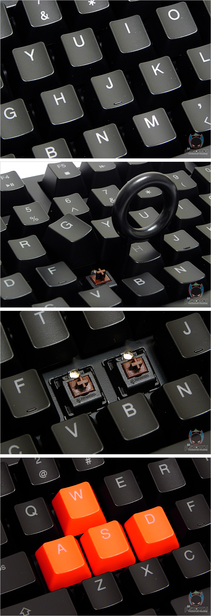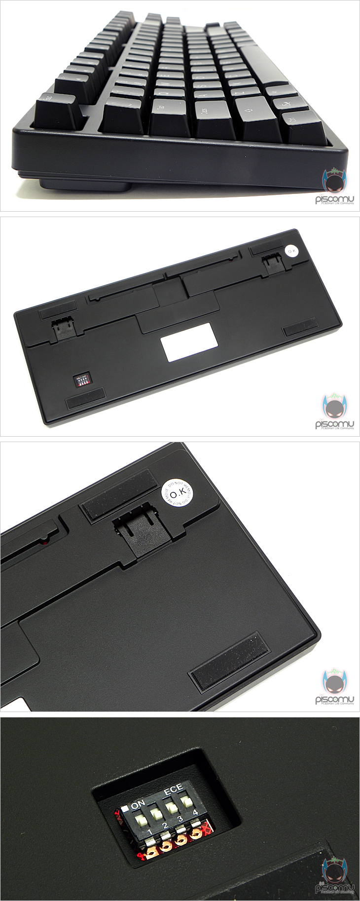이 밖에 키 캡(Key-Caps) 재질은 ABS수지를 사용해 내충격성과 내열성에 강하겠으며, 제공되는 키 리무버 도구를 이용해 쉽게 키 캡 분리를 할 수 있겠습니다. 스위치는 독일의 체리사 MX스위치를 적용했으며, 출시에는 흑축/적축/갈축/청축 4가지 모두를 분류별로 출시해주고 있겠습니다. 여기서, 출시를 해주고 있다라는 것은 LED 지원 역시 총 6가지 색상(Color) Blue, Red, Green, Yellow, Pink, White로 컨셉을 잡고 있기 때문에 LED 색상과 스위치 조합을 제품 수입사가 희망하는 조건으로 제조해주는 것을 말하겠습니다. 그리고, 앞서 부속품으로 제공되는 게임 시 주로 사용되는 WASD 전용 키 캡으로 변경해 키 위치 인식을 좀 더 빨리 할 수도 있겠습니다. 측면에서 키 높이 배열을 확인해 보면, 장시간 사용시에도 피로감이 적도록 위에서 아래로 내려가는 스텝-스컬처2(Step-Sculpture2)를 적용했습니다. 이어서, 키보드 밑면을 살펴보면 각 모서리 부근에는 미끄럼방지를 위한 고무패드를 기본 부착했으며, 기본 높이에서 1단계 높이를 올릴 수 있는 높낮이 받침대도 갖추고 있는 것을 확인할 수 있겠습니다. 그리고, 왼쪽 하단부근에는 DIP 스위치라는 것이 지원되는데, DIP 스위치란 쉽게 말해, 운영체제에 따른 일부 키 기능을 사용자가 직접 하드웨어적으로 변경해주는 기능으로 총 4개의 스위치가 지원되는데, 1번은 왼쪽 Ctrl키와 CapsLock키 위치 교체/유지, 2번은 왼쪽 Alt키와 윈도우 키 위치 교체/유지, 3번은 윈도우 키 잠금/해제, 마지막 4번 스위치는 무한 키와 6키 전환을 가지고 있겠습니다.