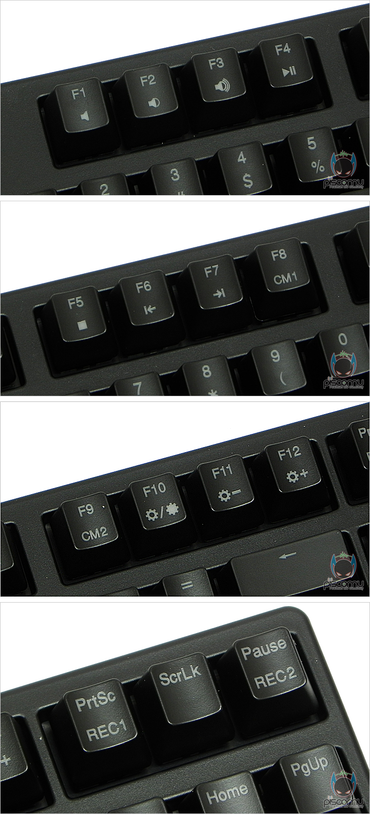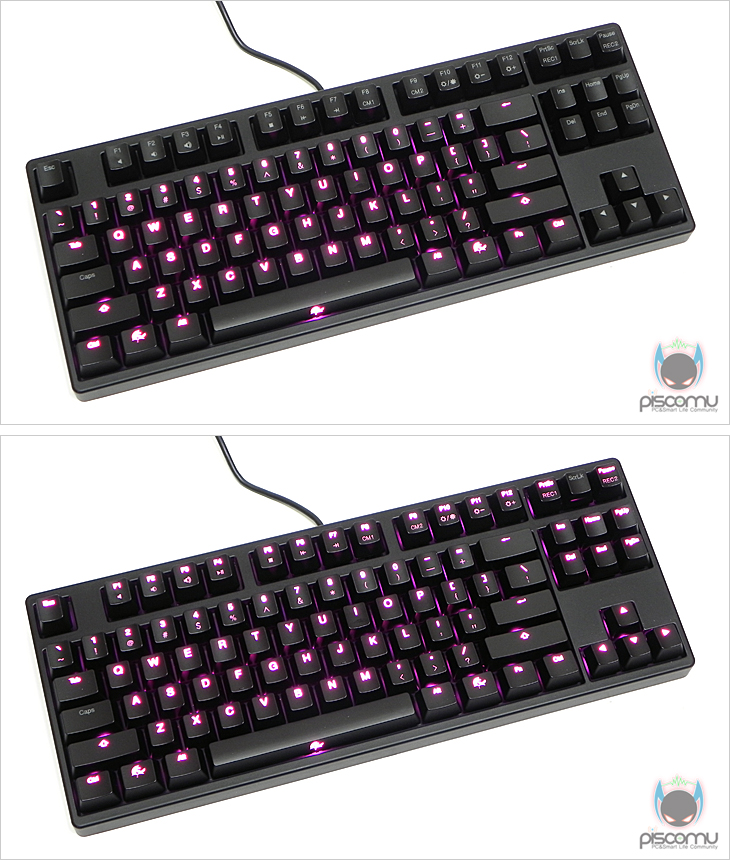 그리고, Fn키 조합에 의한 부가적인 기능 키 지원도 확인할 수 있는데, F1~F7키까지는 볼륨조절 및 재생 기능을 가지고 있으며, F8과 F9는 사용자가 커스텀(Custom)으로 저장한 LED 백라이트(Backlight) 상태를 불러오게 해주며, F10~F12키는 LED 백라이트 밝기와 지원 모드 전환 기능을 가지고 있겠습니다. 그리고, 맨 끝 PrtSc(REC1)과 Pause(REC2)는 커스텀 LED 백라이트 설정을 저장해주는 기능을 가지고 있겠습니다.