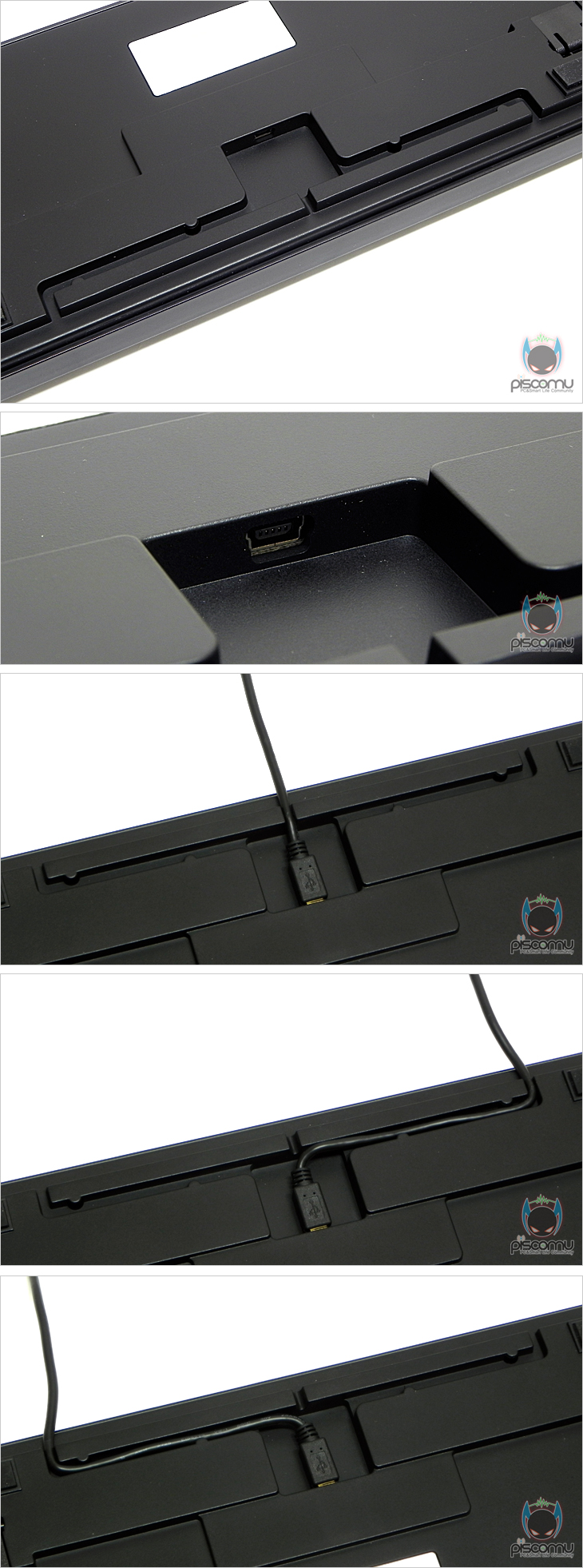 USB 전원 케이블은 키보드와 분리형으로 총 길이는 약 1.5m를 가졌으며, 케이블 정리를 위해 벨크로 타이를 기본 제공해주고 있겠습니다. 또한, USB 포트 금속부분은 신호손실 최소화를 위해 금도금으로 처리가 되었습니다. 분리형 USB 전원 케이블은 키보드 밑면 앞부분에 있는 연결 포트에 연결을 해주면 되겠으며, 연결 포트 앞자리는 케이블 고정 홈 처리로 사용 환경 위치에 따라 케이블을 전면, 좌우 위치로 고정할 수 있겠습니다.