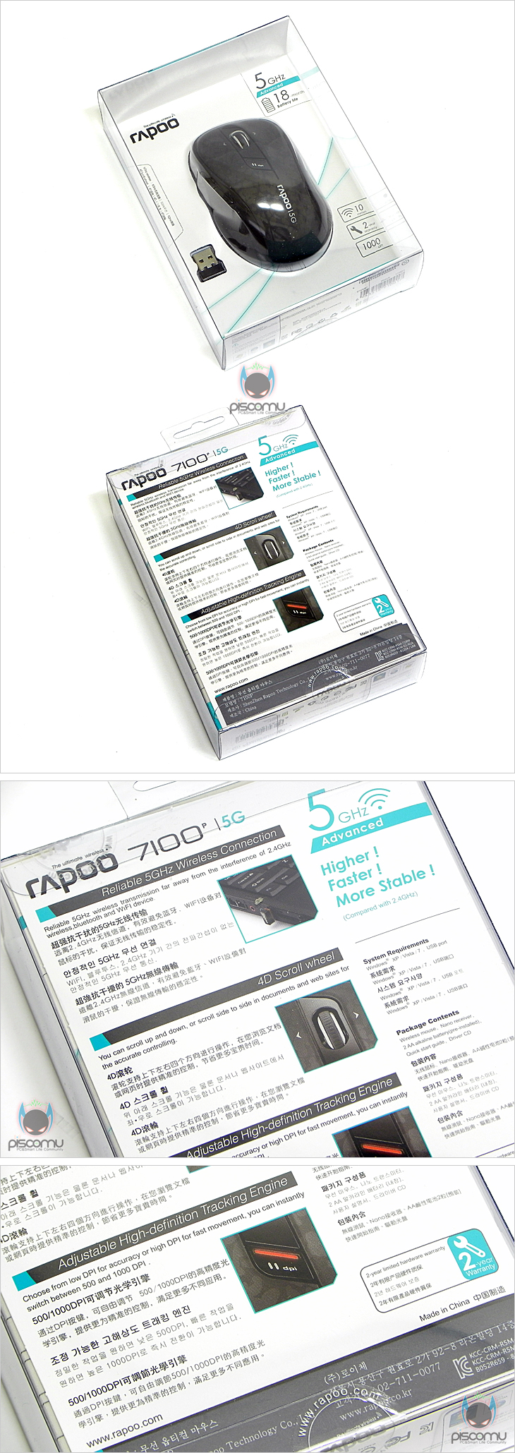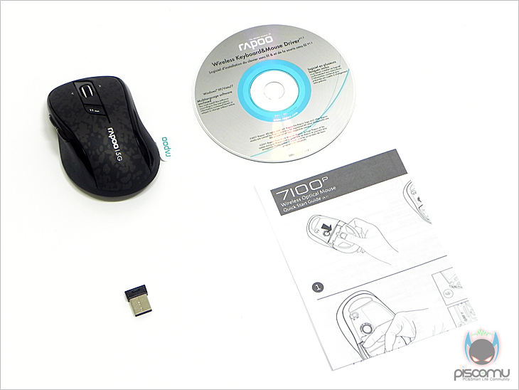 7100P 제품 팩키지 형태는 앞서 그동안 만났던 라푸의 무선 제품들과 큰 차이가 없습니다. 투명 케이스 내부에 포장된 제품을 외부에서 바로 확인할 수 있어, 디자인 부분을 확인할 수 있으며, 박스 후면에는 제품의 특징을 소개해주고 있겠습니다. 대표적으로 5GHz 무선과 좌우 스크롤 지원의 4D 휠-버튼, 500/1000DPI 지원을 대표적으로 소개하고 있겠으며, 국내 수입사는 ㈜로이체로 제품 보증 기간은 2년이 되겠습니다. 제품 구성은 마우스와 수신기를 비롯해, 드라이버 CD와 설명서로 이루어져 있겠습니다.