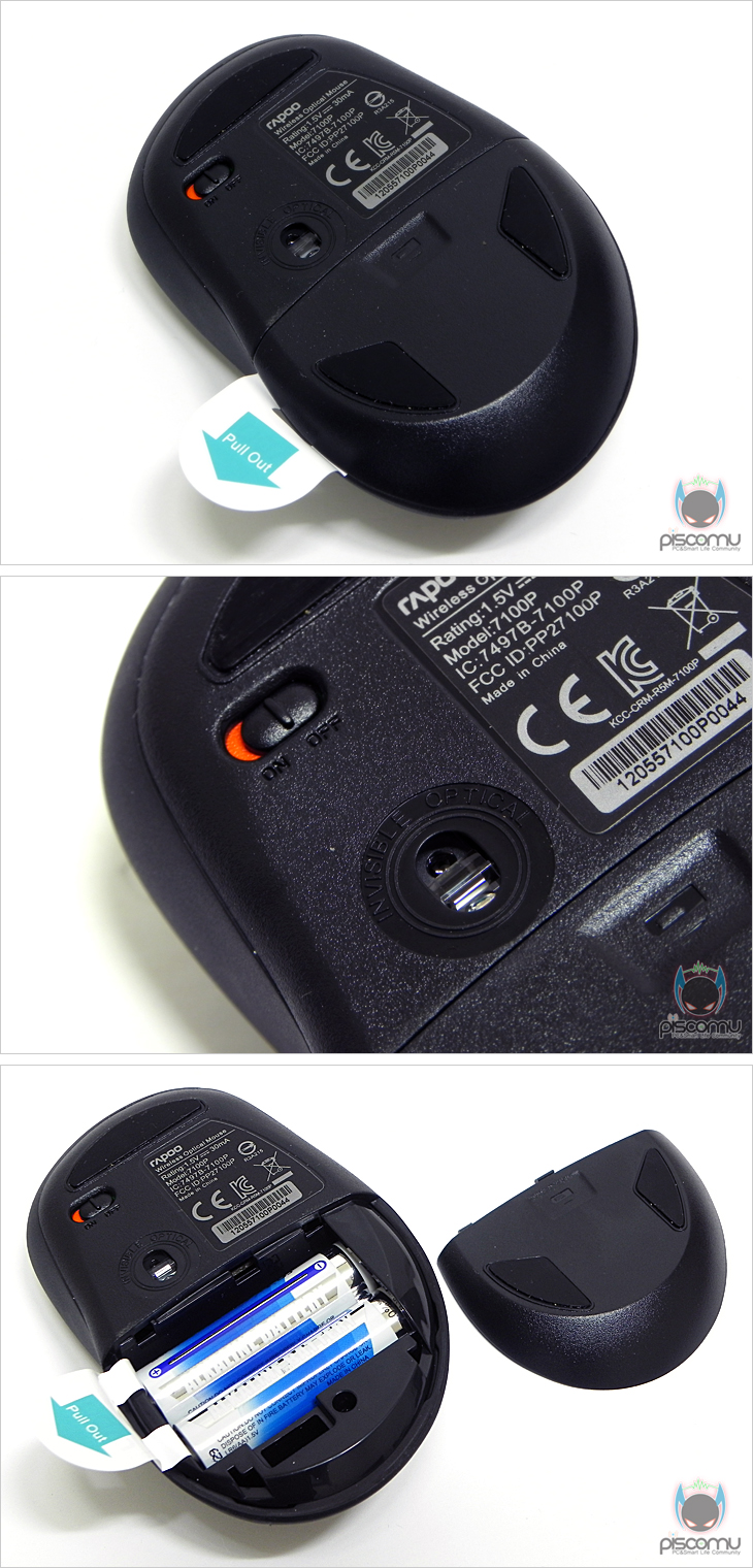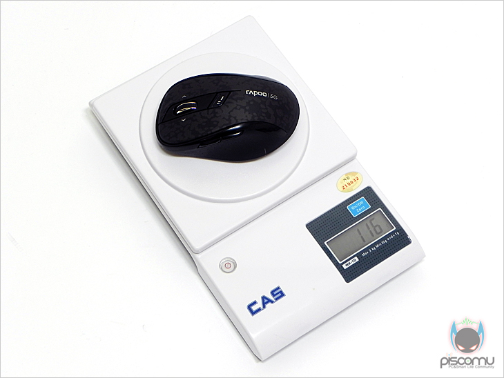 이제, 7100P의 전체적인 디자인을 살펴보겠습니다. 상위 커버에 얼룩 무늬를 적용한 7100P는 오른손 잡이에 맞춘 형태로 좌우 비대칭 형태를 가지고 있습니다. 상위 커버 얼룩 무늬 색상에 따라 제품 색상 구분이 되며, 이외 부분은 전체적으로 블랙색을 가지고 있겠습니다. 버튼 구성에는 기본 좌우 버튼을 비롯해, 가운데 휠-버튼이 기본 배치 되어있는데, 기본 위/아래 스크롤 외에 좌/우 스크롤까지 지원을 해주고 있어 최근 언급되는 4D 휠-버튼이 되겠습니다. 휠-버튼 뒤에는 DPI값 500/1000DPI를 변환해주는 DPI변환 버튼이 배치되어 있겠습니다. 그리고, 측면 경우 좌측에는 기본 웹페이지 앞/뒤 기능의 버튼 2개가 배치되어 있으며, 측면 재질은 그립감을 높여주기 위해 러버(고무) 재질로 처리가 되었으며, 좌측에는 홈 처리가 추가로 되어 있겠습니다. 마우스 밑면에는 앞부분과 뒷부분 양쪽에 각각 테프론 피트를 기본 부착해 마우스 움직임을 원활하게 하도록 해주고 있으며, 왼쪽 상단에는 수신 On/Off 스위치와 바로 아래 광 센서 배치를 확인할 수 있겠습니다. 그리고, 중앙부터 뒷부분까지는 내부 배터리가 장착되는 공간으로 커버를 분리하면 내부에 장착된 AA건전지 2개의 배터리 제공을 확인할 수 있겠습니다. 제조사 측은 최대 수명 기간을 18개월 언급하고 있겠습니다. 수신기를 제외한 마우스에 배터리를 장착한 전체 무게는 측정 결과 116g으로 측정되었습니다. 무선 마우스지만, 적당한 무게감을 가졌습니다.
