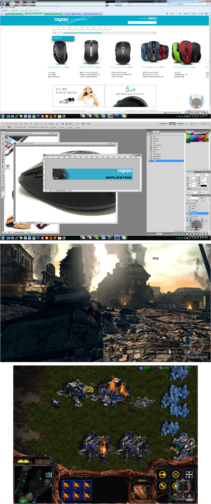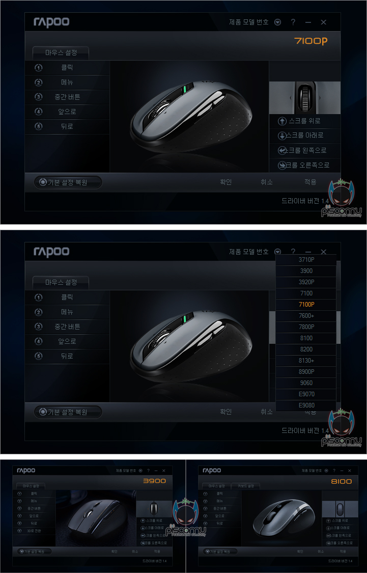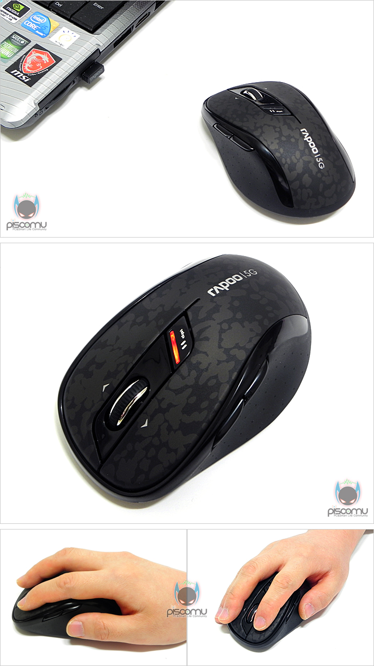7100P를 직접 사용해 보았습니다. 드라이버 CD가 제공되지만, Vista나 윈도우 7 운영체제에서는 드라이버 설치 없이 수신기를 PC나 노트북에 연결한 후 수신 스위치를 On하면 바로 사용 가능하겠습니다. 그리고, DPI스위치 버튼으로 DPI값을 변경하면 변경 작동상태를 램프로 확인할 수 있겠습니다. 오른손 잡이 제품이기 때문에 오른손 그립에 잘 맞춰져 있으며, 전체적인 길이도 길지 않고 적당한 편이라 마우스를 약간 감싸는 그립감을 주겠습니다. 웹-서핑과 편집 작업의 일반적인 사용 환경과 게임 환경에서 각각 사용해 본 결과, 마우스 슬라이딩은 패드에 따라 차이가 있겠지만, 약간 빠른 느낌을 주며, 버튼 클릭 압력도 역시 약간 가벼운 편이라 할 수 있겠습니다. 전반적으로 사용하는데 있어 큰 불편함은 무선 신호에 대한 끊김 현상 역시 5GHz 주파수를 가지고 있어 일반적인 2.4GHz보다 간섭우려가 적기 때문에 끊김에 대한 우려는 없겠습니다. 조금 아쉬운 점이라면, 휠-버튼 스크롤 시 일반 스크롤보다는 조금 가볍게 작동되는 편이라 작동에는 이상이 없지만, 반복적인 스크롤 시 손가락 움직임보다 스크롤 움직임 더 많은 느낌을 받겠습니다. 끝으로, 라푸에도 자사의 제품에 프로그램을 제공해주는데, 해당 프로그램은 자사의 다른 제품들과도 호환되는 프로그램으로 제품 모델 번호에서 사용 중인 해당 제품은 선택하면 그 제품에 맞춰 설정 환경이 맞춰지겠습니다. 프로그램을 통해서는 각 버튼의 고유 기능을 다른 기능으로 변경할 수 있는데, 매크로, 프로그램 실행 외에도 자르기, 복사 등의 기본 기능과 미디어 재생 관련 기능, 그리고 윈도우8 관련 기능과 기능 자체를 없애주는 불능 기능까지 다양하게 지원해주고 있겠습니다. 또한, 한국어 버전이기 때문에 전체적으로 사용법을 쉽게 이해하고 사용할 수 있겠습니다.