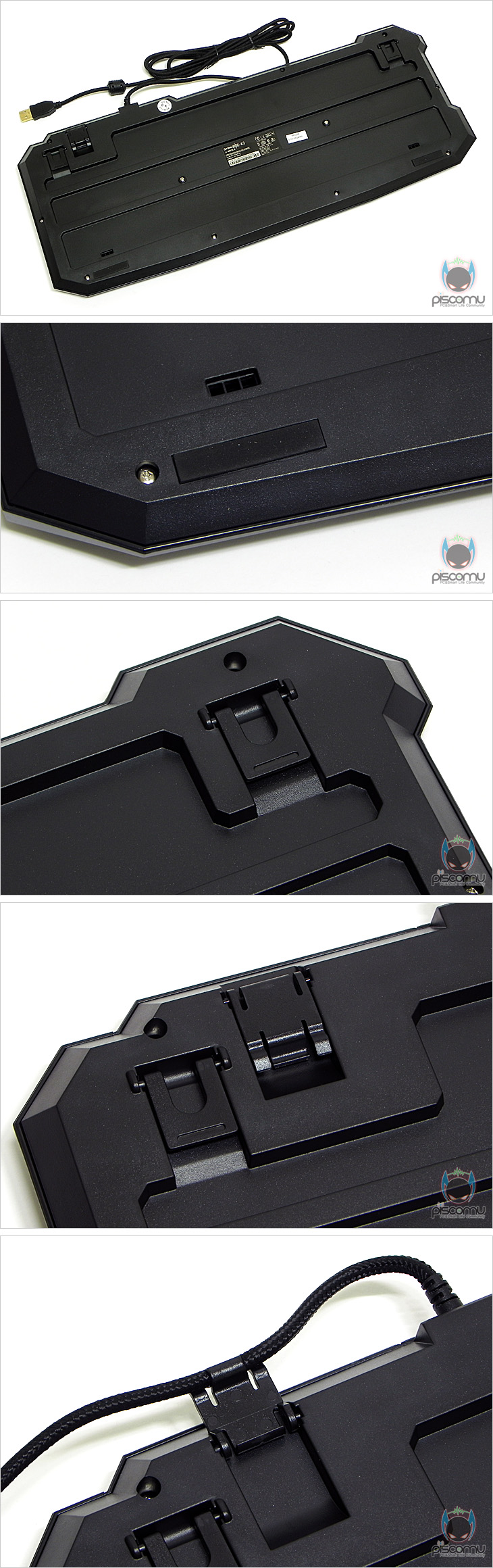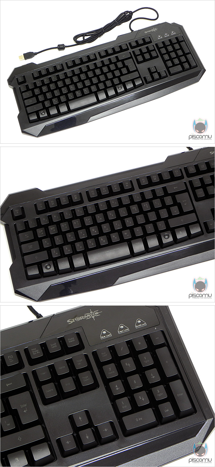 STORMX K3를 살펴보면, 전체적인 색상은 키보드 기본색이라 할 수 있는 블랙이며, 테두리 베젤 디자인은 게이밍 컨셉에 맞춰 메커니즘 느낌으로 처리되었습니다. 전체 키는 106키로 한국식 한글 레이아웃에 맞춰져 있겠습니다. 키들을 좀 더 살펴보면, 키 배열이 한글 레이아웃에 맞춰져 있지만, 엔터(Enter)키가 흔히 보는 ┙자나 ㅡ자형이 아닌 ㄱ자임을 확인할 수 있어, 소비자 입장에 따라 선호도가 나뉠 수 있겠습니다. 그리고, 기본 키 기능 외에 추가적인 기능 키 지원을 위해 Fn키가 지원되는데, Fn키 조합으로 추가되는 기능은 ESC키는 3색(블루/레드/퍼플) LED 지원과 LED Off 기능을, F1~F3키는 키 반복속도 조절, F4~F8키는 음소거, 재생, 볼륨조절 기능을, F9키는 인터넷, F10키는 아웃룩 메일, F11은 전체키는 잠금/해제, F12키는 윈도우키 잠금/해제 기능으로 사용할 수 있겠습니다. 키 캡들에 새겨진 문구들은 레이저 각인으로 처리되어 장시간에도 쉽게 벗겨지지 않도록 했으며, 키 입력방식은 멤브레인 방식이며, 부드러운 입력과 키 입력 시 소음 최소화를 위해 내부에는 러버돔이 적용되어 있겠습니다. 그리고, 게임시 동시 입력 키 지원을 위해 총 8가지 구성의 최대 20키 입력 지원을 인식시킨 Anti-Ghost 기능으로 기계식 키보드의 동시 키 입력 못지 않은 입력 지원을 해주고 있겠습니다. STORMX K3 키보드 밑면을 살펴보면, 아랫부분에는 미끄럼 방지를 위해 고무패드를 기본 부착 해놨으며, 앞부분에는 키보드 기본 높이보다 1단계 높일 수 있게 높낮이 받침대가 적용되어 있겠습니다. 또한, 앞부분 한 편에는 케이블을 고정할 수 있게 고정 걸이를 지원한 점도 눈에 띄겠습니다. 끝으로, 케이블 부분을 살펴보면, 총 길이는 약 1.9m를 가져 유선으로 충분한 길이이며, 케이블 전체는 깔끔하게 패브릭 슬리빙 처리가 되어 있겠습니다. 또한, 신호 손실 최소화를 위해 USB 인터페이스는 금도금 처리를 했으며, 앞부분에는 노이즈 필터를 적용 했습니다.