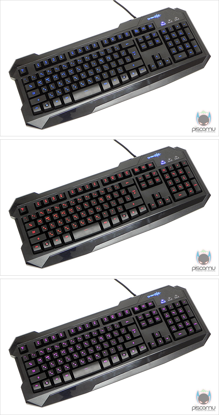 직접, STORMX K3를 사용해 보았습니다. 별도의 드라이버 설치과정 없이 USB 인터페이스를 연결하면 바로 사용이 가능하며, 앞에서 언급한 3색 LED 색상은 Fn+ESC키 조합으로 블루→레드→퍼플 순으로 전환이 되며, 사용자가 원하는 색상을 선택 적용하면 되겠습니다. 또한, STORMX K3는 멤브레인 키보드지만, 반복속도를 조절해주는 기능을 지원해주는데, 일반이 만든 체크 프로그램을 통해 F1키부터 F3키까지 Fn키 조합으로 각각 적용해 본 결과, F1키 1x속도는 일반 멤브레인 키보드 속도를 보여주며, 나머지 F2키 x2, F3키 x3도 단계적으로 빠른 속도를 보여주는 것을 확인할 수 있어, 소비자가 원하는 키 반복속도를 설정할 수 있겠습니다. 끝으로, 키보드 위주의 게임에 직접 사용해 보았습니다. 키 압력은 멤브레인과 러버돔 방식에 의한 부드러운 압력을 그대로 느낄 수 있으며, 소음부분 역시 러버돔 적용은 작은 편입니다. 동시 키 입력은 Anti-Ghost 범위 내에서 적용되는 키 조합들은 무리 없이 입력이 가능하며, 벗어나는 경우에는 사용자가 직접 게임 내의 컨트롤 설정으로 범위 내로 변경해 적용하면 게임 진행에 큰 불편함을 없겠습니다. 그리고, 볼륨 조절 기능키 역시 운영체제 통합으로 적용되기 때문에 프로그램에 상관없이 바로 적용이 가능하겠습니다. 전반적으로 멤브레인 제품으로써 사용에는 만족스러운 편이라 할 수 있겠습니다.