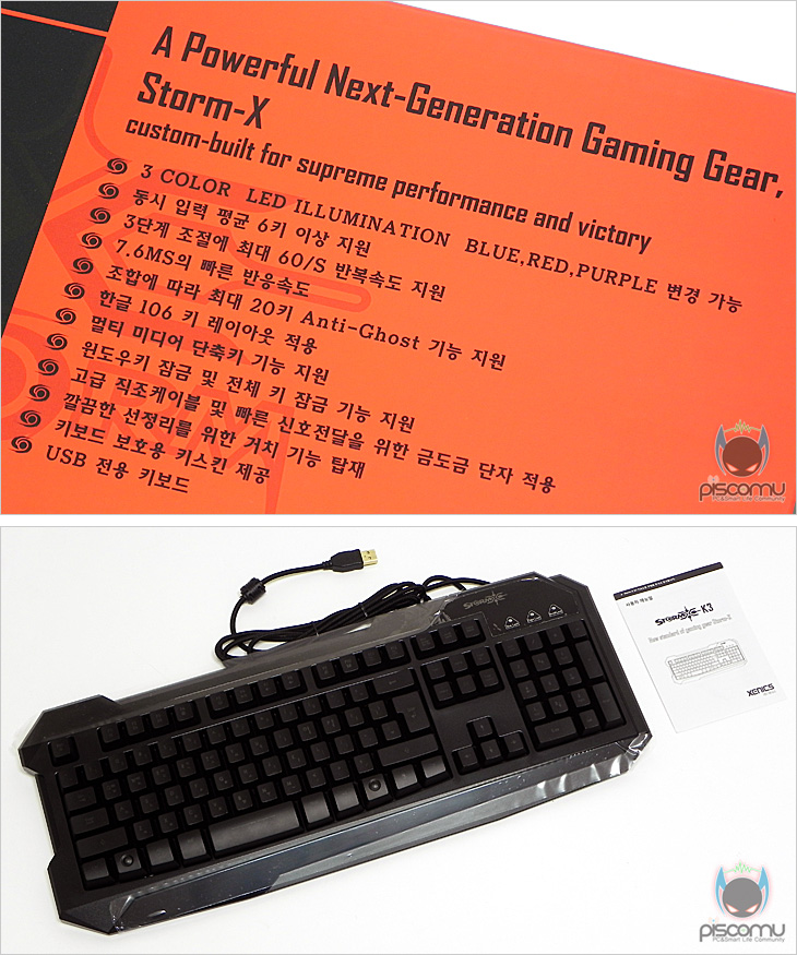 STORMX K3는 STORMX라인업에 처음 선보이는 게이밍 키보드입니다. 이는 제품 박스 디자인을 보고도 쉽게 파악할 수 있습니다. 제품 박스에는 모델명과 게이밍 컨셉 문구, 제품의 특징을 간략하게 전면에 언급하고 있습니다. 박스 후면에는 좀 더 자세하게 제품의 특징을 소개하고 있는데, 키 반복속도 지원부터 멀티미디어 핫 키, 윈도우키/전키 잠금 지원, Anti-Ghost 기능 지원, 3색 LED 지원, 제품 디자인, 받침대, 포트 처리에 대해 언급을 하고 있겠습니다. 상당히 자세히 언급이 되어 있기 때문에, 소비자 입장에서 구입시 충분한 정보를 얻을 수 있겠습니다. 그리고, 요약 목록적으로도 언급이 되어 있어 쉽게 파악할 수 있습니다. 제품 구성은 간단하게 키보드와 설명서로 이루어져 있습니다. 또한, 키 베젤 부분적으로 유광처리가 된 곳이 있어, 초기 상태 시에는 보호비닐이 부착되어 있겠습니다.