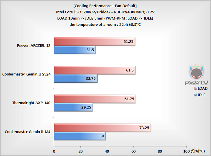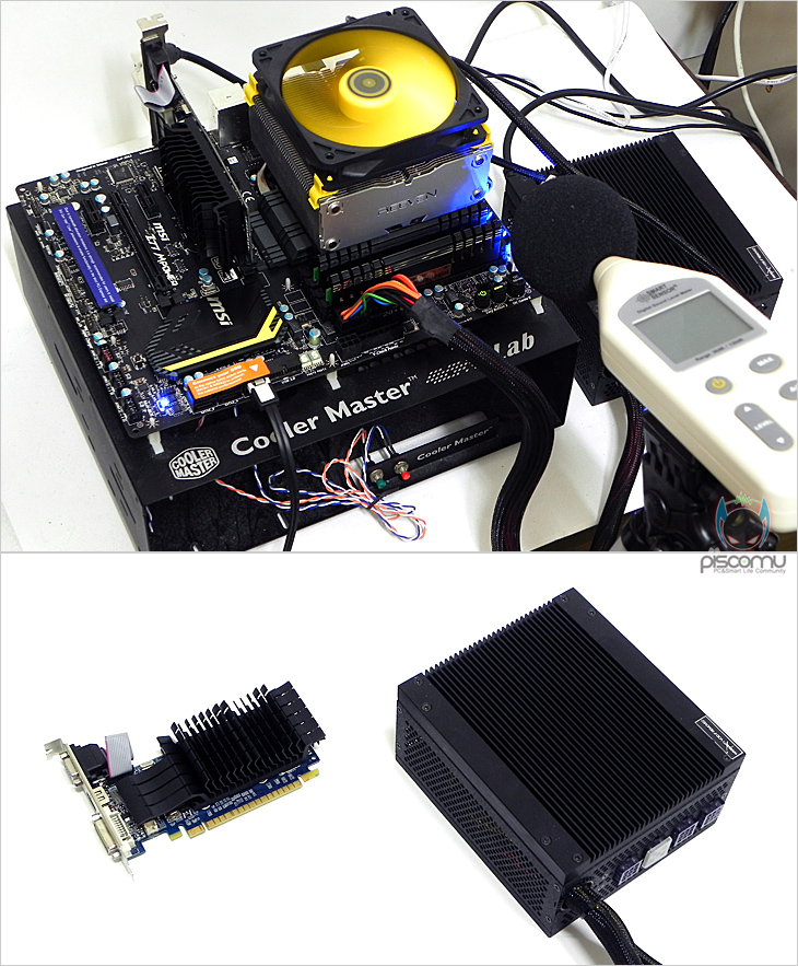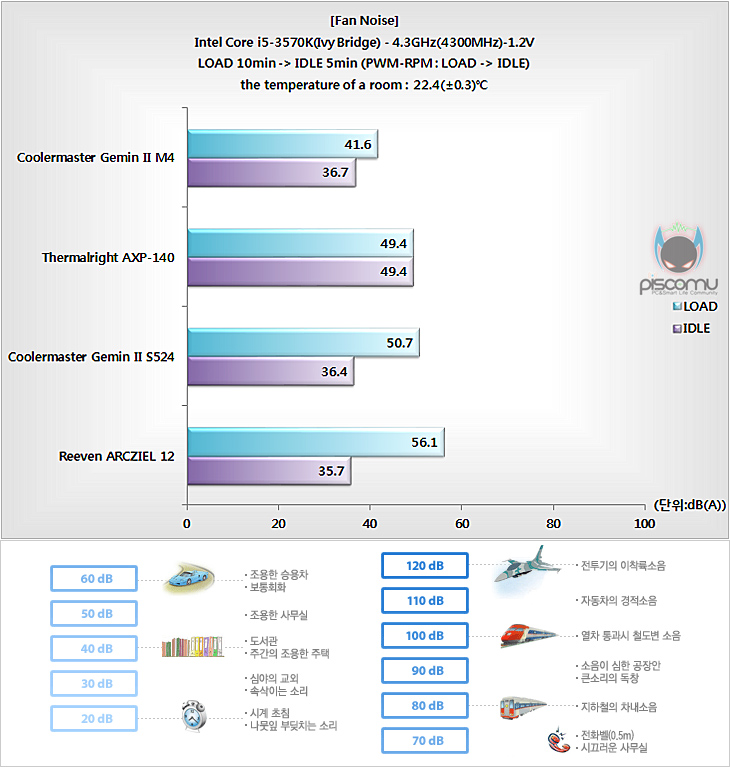 이제, ARCZIEL 12의 냉각 성능을 확인해 보겠습니다. 플라워형 쿨러 특성상 위에서 공기 유입을 해 아래로 빠져나가는 형태로 CPU주변에 대한 쿨링은 대부분 영향을 많이 주기 때문에 전원부의 온도를 큰 차이가 없습니다. 따라서, 프로세서의 성능과 IDLE와 LOAD에서의 팬 속도, 그리고 팬 소음에 대해 확인을 해보겠습니다. 또한, 프로세서는 인텔 아이비브릿지 i5-3570K으로 기본 클럭에서의 성능 차이는 큰 의미가 없기 때문에 바로, 오버클럭(4.3GHz) 상황에서 성능 확인을 진행했습니다. 쿨러 팬 소음 측정을 위해 VGA와 파워서플라이는 팬이 없는 팬리스(Fanless) 구성을 했으며, 저장장치는 SSD를 사용했습니다.