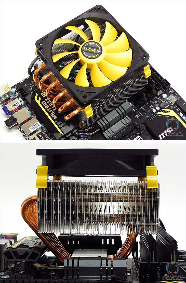 결합 후, 메인보드와의 간섭여부를 확인해 본 결과, 간섭 발생은 생기지 않았으며, 방열핀의 높이도 메모리에 방열판이 붙은 제품보다 위에 있어, 메모리 방열판과의 간섭도 발생하지 않겠습니다. 전체적으로 장착에 있어 어려움은 없지만, 결합하는 부분이 몇 가지 있어, 조금 번거로움을 느낄 수 있겠습니다.