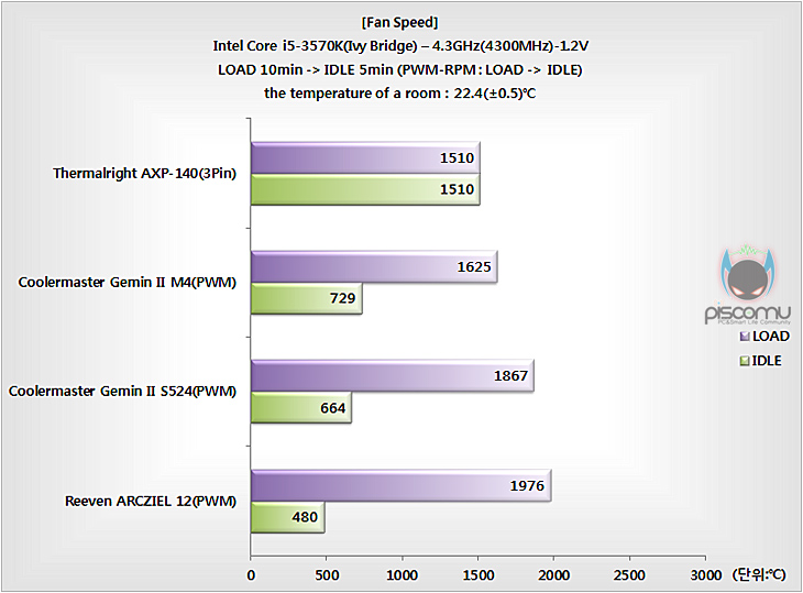 이번엔 팬 속도를 확인해 보는데, IDLE와 LOAD 상황에서의 각 팬 속도를 확인해 본 결과, 각 쿨러의 기본 제공되는 팬의 기재된 범위에서 모두 최저와 최고 속도를 보여줬습니다. ARCZIEL 12는 IDLE에서 가장 낮은 속도를 보였지만, LOAD에선 가장 높은 속도를 보였습니다.