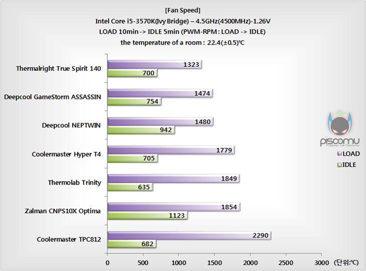 이번엔 진행하는 동안의 팬 속도 확인을 해보는데, 기본적으로 듀얼팬 구성이 되는 NEPTWIN의 팬 속도를 확인해 본 결과, 기본 제공되는 팬 중 PWM팬의 속도 범위에서 LOAD와 IDLE이 모두 최대/최소 속도로 작동되는 것을 확인할 수 있는데, 특히, 최소 속도는 2번 째로 높은 속도로 앞에 프로세서와 전원부의 IDLE 온도결과에 영향을 주었다 할 수 있겠습니다.