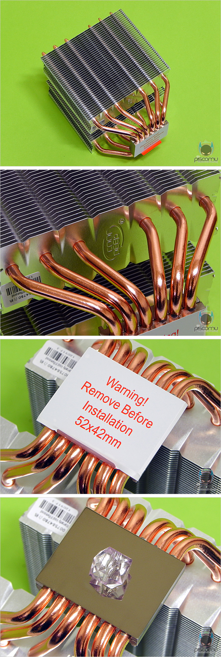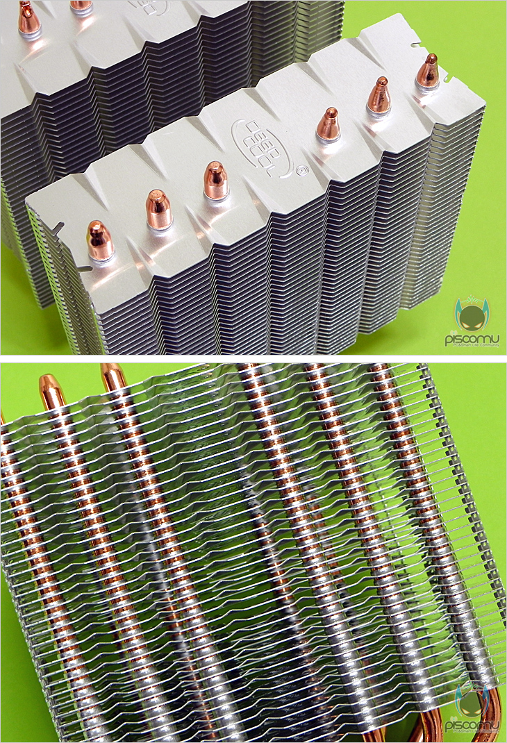 방열핀을 좀 더 살펴보면, 일정간격으로 톱니 모양 디자인으로 처리된 것을 확인할 수 있는데, 전면에서 보면, 일정 간격의 파도모양처럼 보입니다. 이런 디자인 처리 역시 해당 제품에 최적의 쿨링효과를 주기 위한 디자인 처리라 할 수 있겠습니다. 참고로 방열핀의 총 개수는 80개로 양쪽 각각 40개씩으로 나뉘어져 있겠습니다. 방열핀을 통과하는 히트파이프는 총 6개로 지름 6mm 히트파이프가 사용되었으며, 별도의 도색처리 없이 구리 재질 그대로 적용을 했습니다. 또한, 방열핀을 통과하는 방식은 관통식이 되겠습니다. 그리고, 프로세서(CPU)와 맞닿는 베이스 부분 사물이 비칠 정도로 매끄럽게 래핑처리를 했습니다.