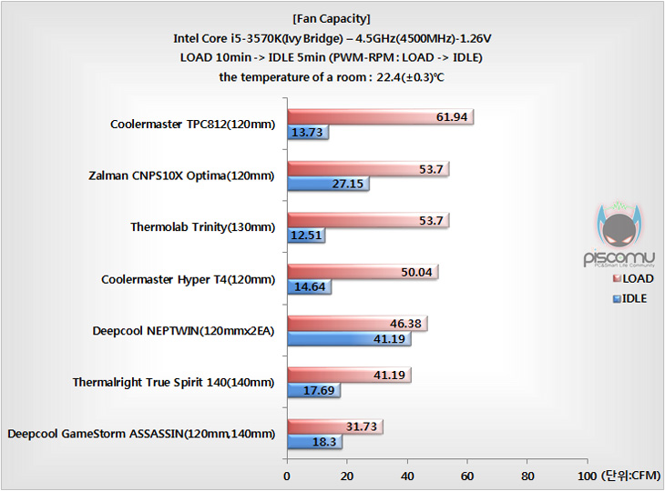 팬 소음은 속도보다 좀 더 나은 결과를 보여줬습니다. 기본적으로 듀얼팬을 구성한 NEPTWIN이지만, LOAD에선 두 번째로 낮은 소음치를 보여줬으며, IDLE에선 가장 높은 소음치를 보여줬지만, 약 39dB(A)이라 정숙한 편에 속하겠습니다. 앞서 냉각 성능과 비교를 한다면, 소음대비 냉각 성능이 만족스럽게 잘 나오는 편이라는 것을 확인할 수 있겠습니다. 끝으로, 쿨러 후면을 통해 나오는 팬의 풍량을 120x120mm 규격에서 측정해 본 결과, 약 40CFM대로 풍량이 발생하는 것을 확인할 수 있었는데, 이는 NEPTWIN에 기본 제공되는 팬이 120mm라는 점과 속도가 상위 풍량이 많은 쿨러들보다 낮다라는 점에서 비교하면 꽤 많은 편임을 확인할 수 있습니다. 즉, 전원부에 충분히 영향을 줄 수 있는 풍량이라 할 수 있겠습니다.
