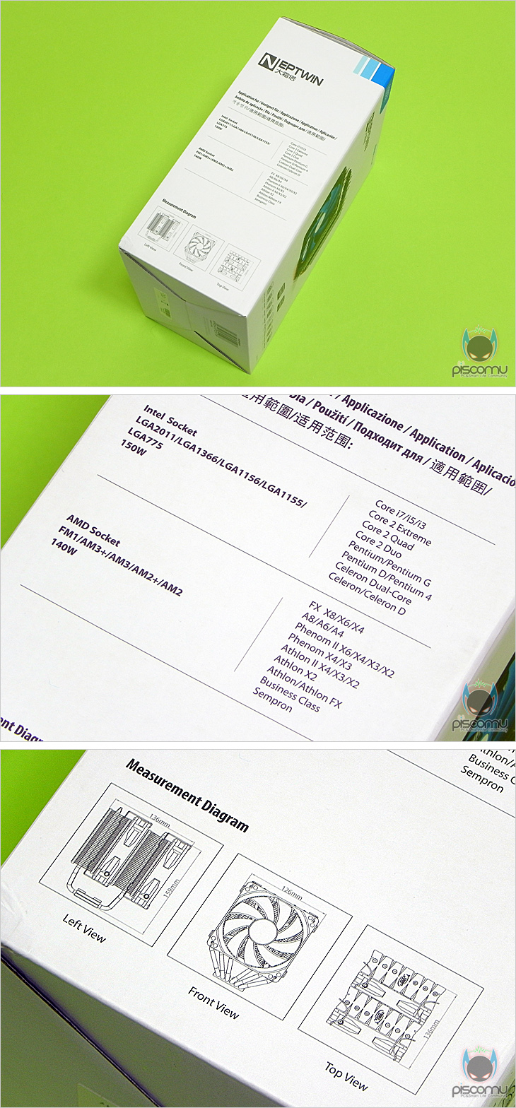 박스 측면에는 프로세서 소켓 지원여부를 확인할 수 있는데, 인텔과 AMD 모두 지원을 해주면, 최신 프로세서까지 지원해주고 있어, 현재 판매되고 있는 모든 프로세서에선 장착 지원이 가능하겠습니다. 그리고, 도면식의 제품 사이즈도 표기를 해놓고 있어, 자신이 사용하고 있는 PC케이스에 쿨러 장착 여부를 판단할 수 있겠습니다. 또한, 나머지 반대편 박스 측면에는 각 나라별 언어로 제품의 기본 스펙정보를 소개하고 있는데, 한국어 역시 기본 포함이 되어 있으며, 정보를 통해서 제품 사이즈 외에도 기본적으로 제공되는 팬의 속도/풍량/소음 등을 확인할 수 있겠습니다.