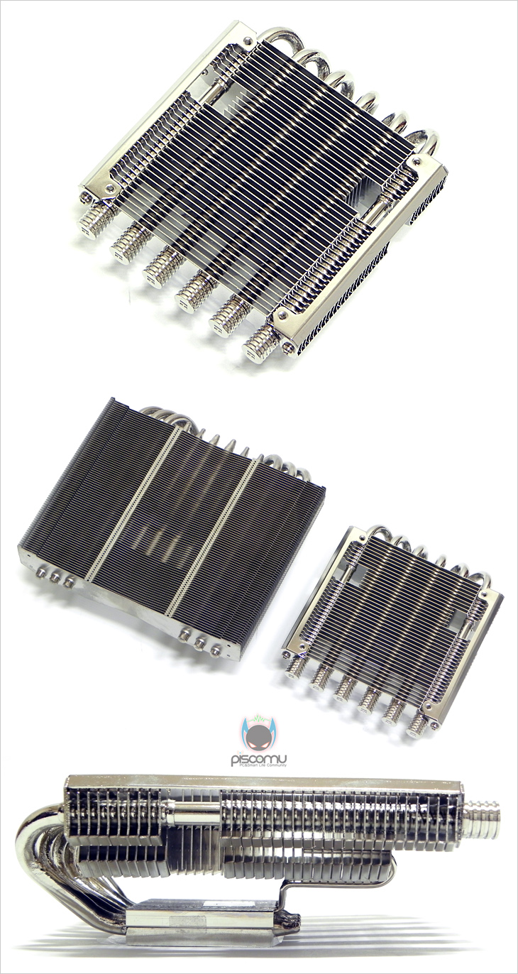 AXP-100를 살펴보면, 전체적인 생김새는 이미 자사에서 출시한, AXP-140과 흡사합니다. 축소판이란 느낌을 받을 수 있겠습니다. 또한, HPTC/ITX를 겨냥해서 전체적인 쿨러의 높이도 상당히 낮은데, 팬까지 장착해도 높이는 60mm가 되지 않겠습니다. 하지만, 사이즈가 작아졌다고 해서, 제품을 낮게 볼 순 없습니다. 바로, 타워형이나 하이엔드 플라워형 쿨러처럼 지름 6mm의 히트파이프를 6개 적용했기 때문입니다. 즉, HTPC/ITX를 겨냥했지만, 성능은 결코 나쁘지 않다라는 것을 짐작해볼 수 있겠습니다. 그리고, 히트파이프가 끝나는 부분에는 깔끔하게 제조사 로고로 커버 처리를 해놨습니다.