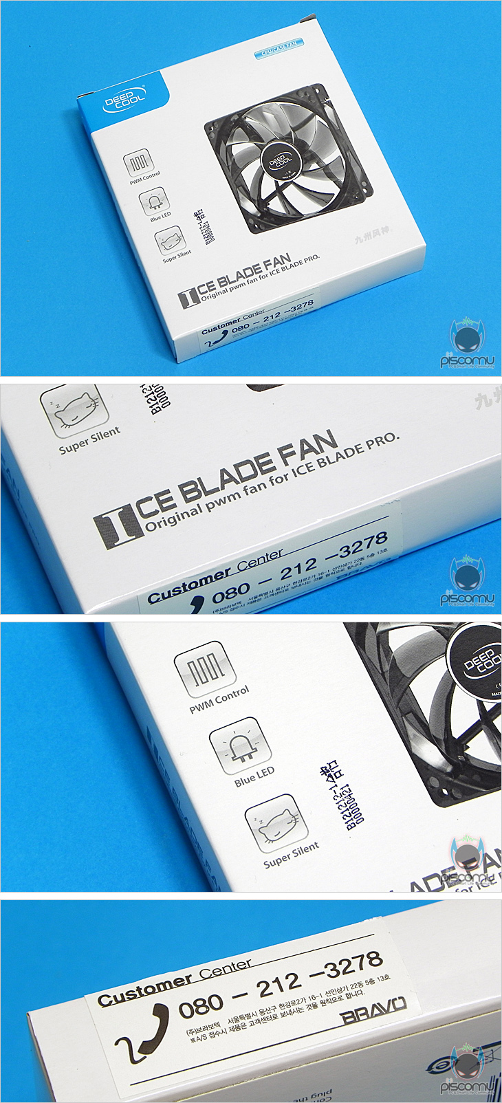 X-FAN이 기본 케이스 팬(CASE FAN) 컨셉이라면, 이번 살펴볼 Ice Blade FAN은 CPU쿨러와 케이스 팬 2가지 모두 공용되는 컨셉입니다. 이미 자사의 CPU쿨러 모델 중에도 Ice Blade FAN이 적용되고 있는데, 일단, 제품 박스를 통해 제품의 디자인을 바로 확인할 수 있으며, 모델명과 작동방식, LED색상, 저소음 특징도 확인할 수 있습니다. 그리고, 역시 국내 정식수입원인 ㈜브라보텍의 고객센터 연락망도 확인할 수 있겠습니다. 박스 후면을 통해서는 역시 제품의 기본 스펙 정보를 확인할 수 있는데, 팬 크기, 무게, 전압, 전류, 속도, 풍량, 베어링 방식을 표기해놓았습니다. 그리고, 2개의 팬을 하나로 연결해 속도조절 할 수 있게 Y자 케이블이 추가 제공되는 문구를 확인할 수 있겠습니다.