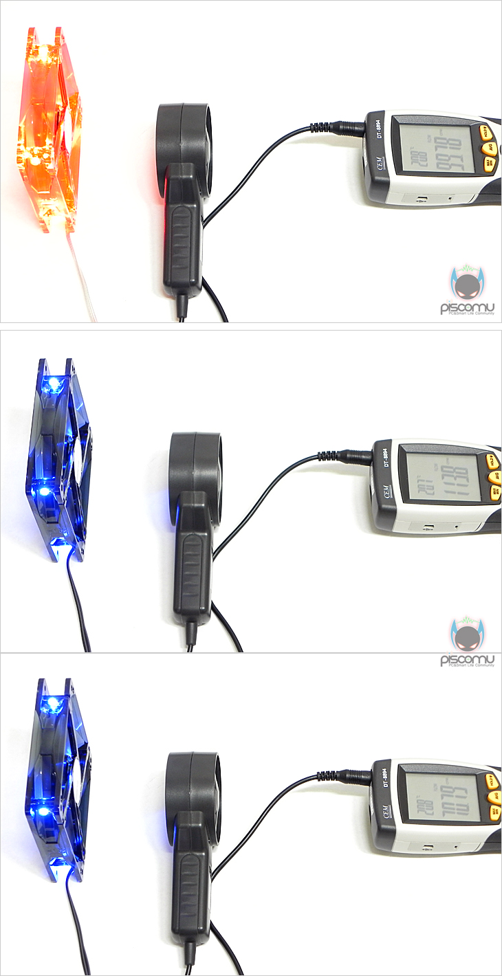 이번엔 팬의 풍량을 측정해보는데, 약 7cm거리를 두고 X-FAN과 Ice Blade FAN의 풍량을 측정해보았습니다. 일단, X-FAN 경우 1300RPM를 가지고 작동하는데, 측정결과 약 100CFM정도의 풍량을 발생시키는 것을 확인할 수 있으며, Ice Blade FAN 경우는 900~1500RPM 범위로 1500RPM일 경우 약 114CFM을, 900RPM일경우는 약 70CFM정도의 풍량을 발생시키는 것을 확인할 수 있겠습니다. 모두 발열을 해결하는데 부족함이 없는 풍량이 되겠습니다.