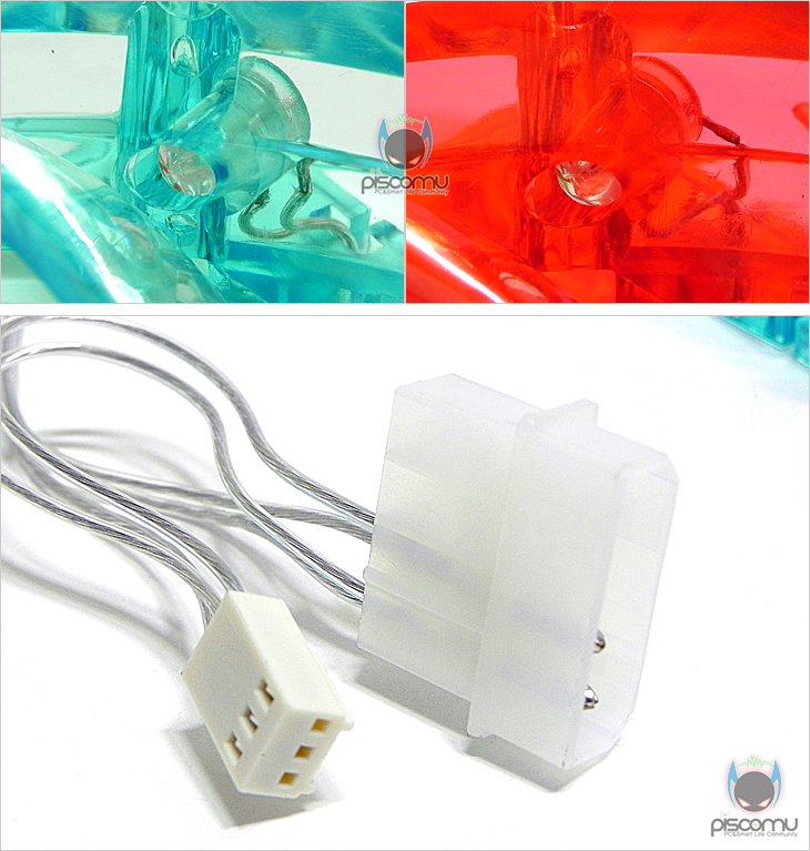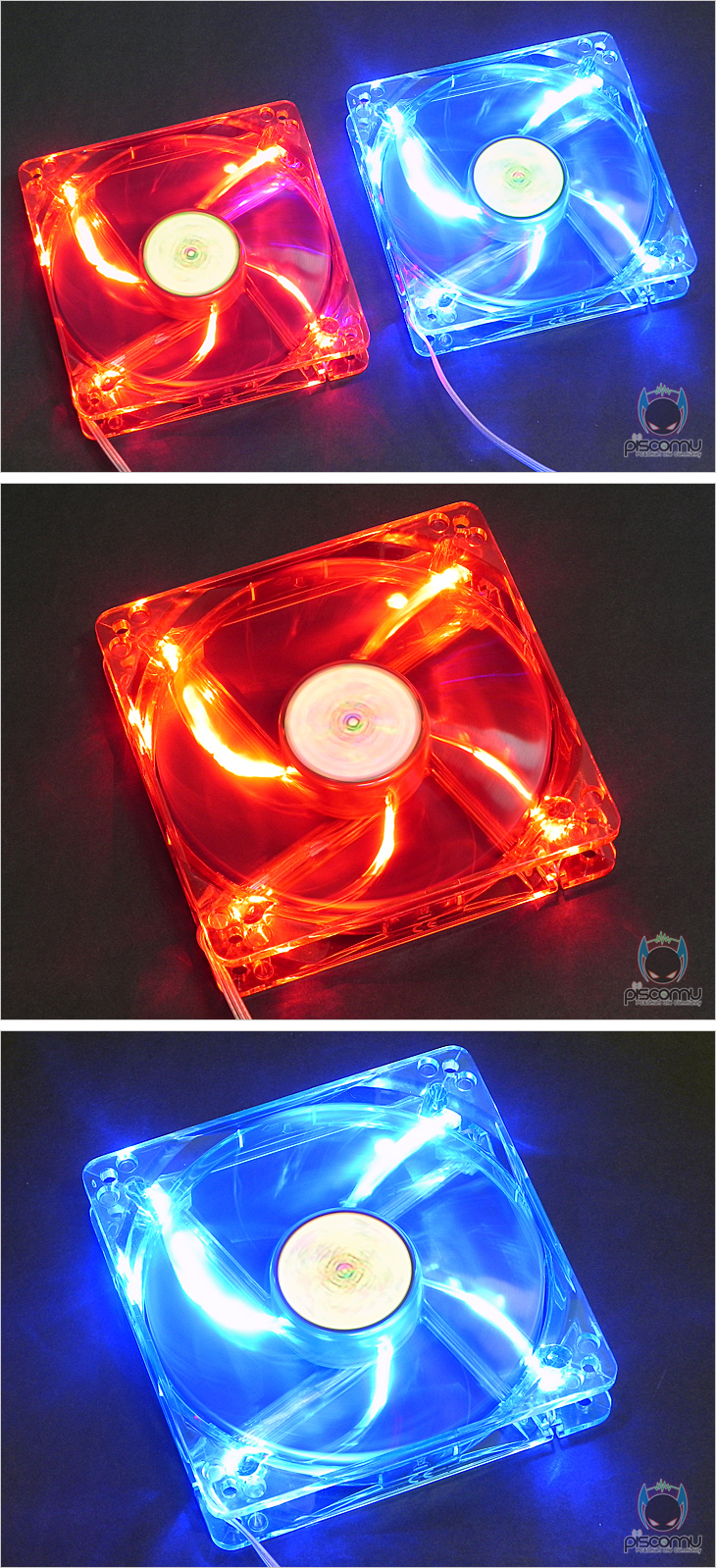 X-FAN 시리즈에 새롭게 추가 출시된 2종 모델을 살펴보면, 이전 모델과 가장 큰 특징은 바로 팬 베젤/블레이드 색상과 LED색상이 통일되었다라는 점입니다. 이전 모델들은 베젤/블레이드가 투명하거나 오렌지, 그린색에 LED색상은 옐로우, 그린, 블루 조합이였는데, 이번 2종 모델은 베젤/블레이드가 레드면 LED도 레드, 블루면 블루로 똑같이 통일을 했습니다. 색상 통일감을 제외하고는 나머지 외형적인 생김새와 작동방식은 모두 이전 모델과 동일합니다. 블레이드(날개)는 총 9개로 구성되어 있으며, 베젤과 블레이드에 색상이 처리되어 있지만, 반투명 성질을 가지고 있어, 마치 크리스탈 느낌을 주는데, 이러한 처리를 UV라고 합니다. 기존 모델 역시 이런 UV처리를 적용했습니다. 이런 UV적용은 LED와 조합되면, 좀 더 화려한 색상 느낌을 주면서 튜닝효과를 극대화 해주겠습니다. LED는 팬의 각 모서리 부근 안쪽에 배치되어 있으며, 팬 연결 작동방식은 일반 케이스 팬과 차이 없이 기본 3핀으로 연결되지만, P-ATA 연결방식도 함께 지원을 해주겠습니다.