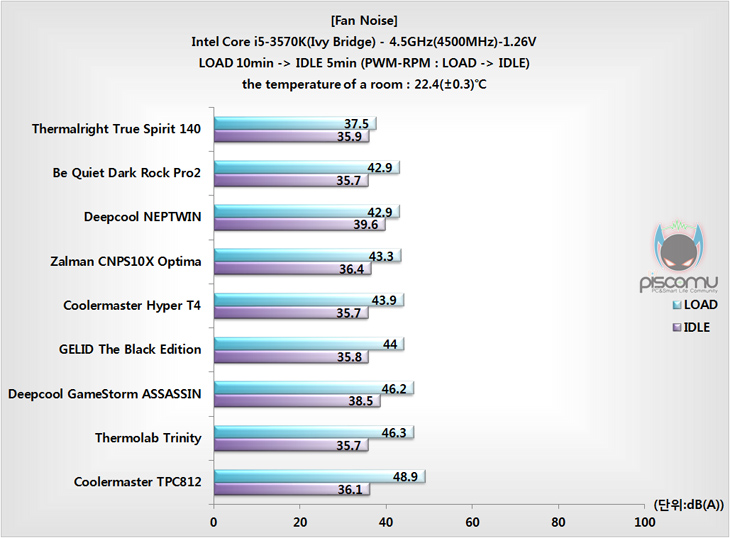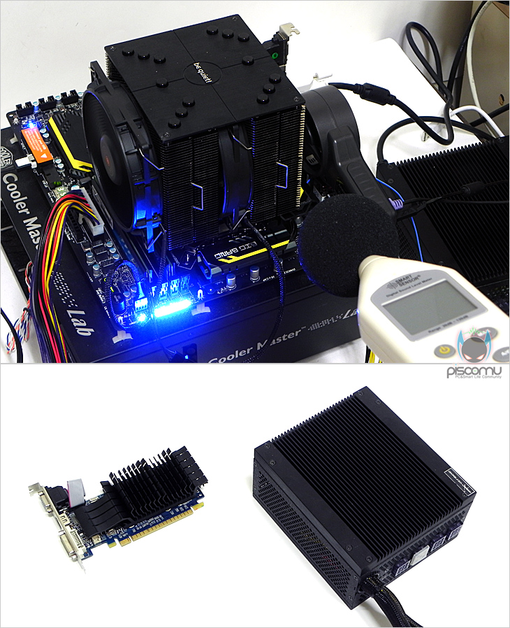 이제, Dark Rock Pro2의 성능을 확인해 보겠습니다. 시스템 기반은 인텔이며, 프로세서는 i5-3570K. Dark Rock Pro2 역시 트윈 타워형 쿨러이기 때문에 바로 오버클럭(4.5GHz) 상황에서 진행이 되겠습니다. 쿨러 전면에 유입되는 공기의 온도를 최대한 유지하는 상황과 실내온도를 유지하는 상황에서 쿨러의 기본 성능인 프로세서 냉각 성능을 비롯해 전원부 쿨링 영향, 팬 속도, 팬 소음, 팬 풍량 순으로 확인 진행을 하겠습니다. 팬 소음 측정을 위해 VGA와 파워서플라이(PSU)는 팬이 없는 팬리스(Fanless)로 구성했습니다.