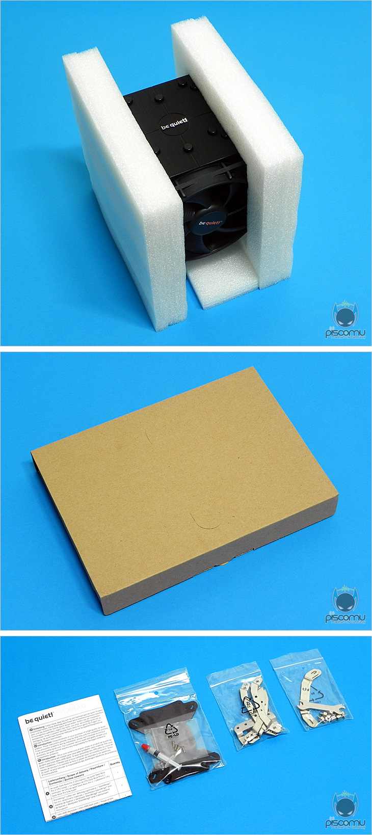 박스 디자인만큼이나 제품 포장도 깔끔하게 잘 되어있는데, 쿨러는 크기에 맞춰 우레탄폼을 적용했으며, 부속품은 별도의 박스에 보관되어 있습니다. 또한, 설명서를 비롯한 각 부속품도 용도별로 각기 비닐 포장되어 있겠습니다. 설명서에는 제품 장착 가이드를 담고 있으며, 부속품에는 Inte/AMD 공용 백플레이트, Intel 각 소켓별 리텐션 플레이트, AMD 리텐션 플레이트, 볼트와 너트, 와셔, 렌치, 소량의 써멀컴파운드가 제공되겠습니다.