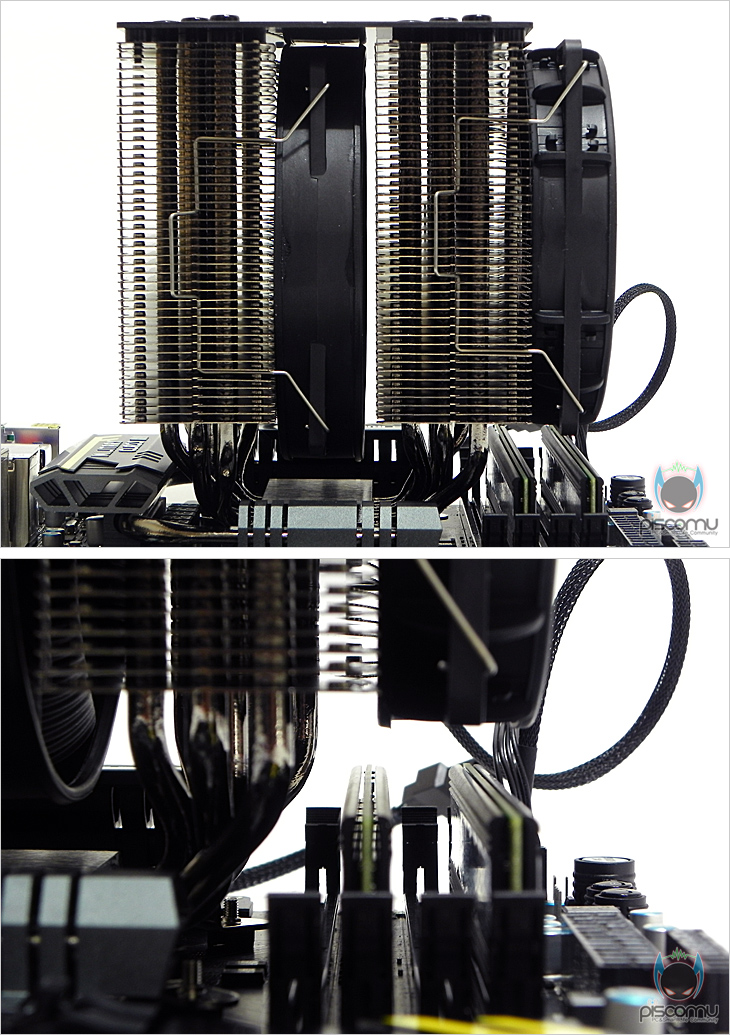 장착 후 쿨러의 영역부분을 살펴보면, 일단, 쿨러 자체의 기본 크기가 상당하기 때문에 메인보드의 메모리 슬롯부분은 전면 팬을 장착하면 거의 다 차지를 합니다. 하지만, 메모리와 팬 사이의 간격이 다소 있기 때문에, 일부 메모리 방열판이 있는 모델들도 장착은 가능할 것으로 판단됩니다.