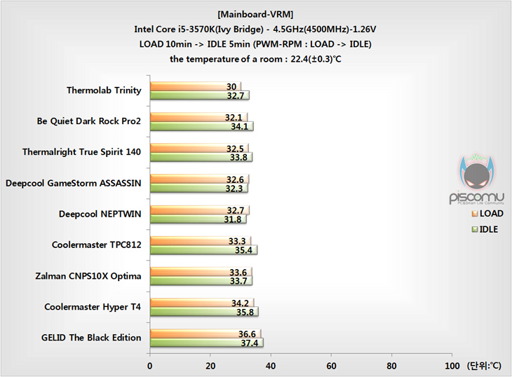 먼저, 프로세서의 냉각성능부터 살펴보면, Dark Rock Pro2는 기본적으로 팬이 2개 제공되어서 듀얼 팬 구성이 되겠습니다. 오버클럭에서 LOAD 10분 후 5분 IDLE로 돌아가는 진행에서 프로세서 냉각 성능을 확인해 본 결과, 상위 수준의 성능을 보여주는 것을 확인할 수 있습니다. LOAD보다는 IDLE에서 좀 더 나은 성능을 보이며, LOAD는 일반 타워형 쿨러 중 고성능 모델과 비슷한 수준으로 트윈 타워형라는 점에선 조금 아쉬울 수 있지만, 쿨러로써의 냉각성능을 충분히 잘 보여준다 할 수 있겠습니다. 이번엔 진행 동안의 메인보드 전원부에 주는 쿨링 영향을 확인해보는데, 앞에 프로세서 성능보다 더 나은 결과를 보여줬습니다. 비교 모델들 중 두 번째로 낮은 온도치를 보여줘서 전원부에 주는 쿨링영향이 꽤 있는 것을 확인할 수 있는데, 아쉬운 점은 IDLE 상황에서 LOAD만큼 보여주질 못했습니다. 그래도, 쿨링의 영향을 준다라는 부분에서 기본 제공되는 팬 중 가운데 135mm 팬의 영향이 꽤 있는 것으로 판단할 수 있겠습니다.