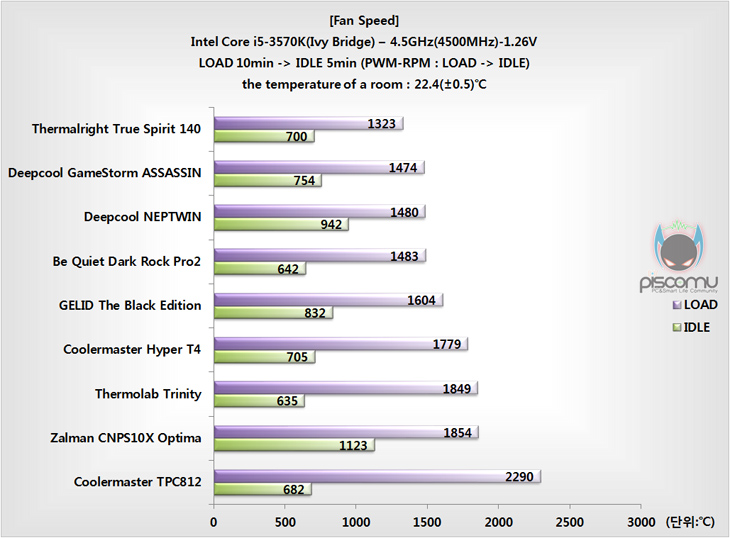 진행 동안의 팬 속도는 앞에서 언급된 2개의 팬 중 가운데 팬의 최대 속도에 근접하는 작동을 보여줬습니다. 그리고, 앞에서 최대 속도만 확인할 수 있었는데, 진행하는 동안 IDLE상황에서 최저 속도를 확인해 본 결과 약 640RPM대로 작동되는 것을 추가로 확인할 수 있겠습니다. 비교되는 다은 트윈 타워형 쿨러들과 비슷한 속도라 할 수 있겠습니다.