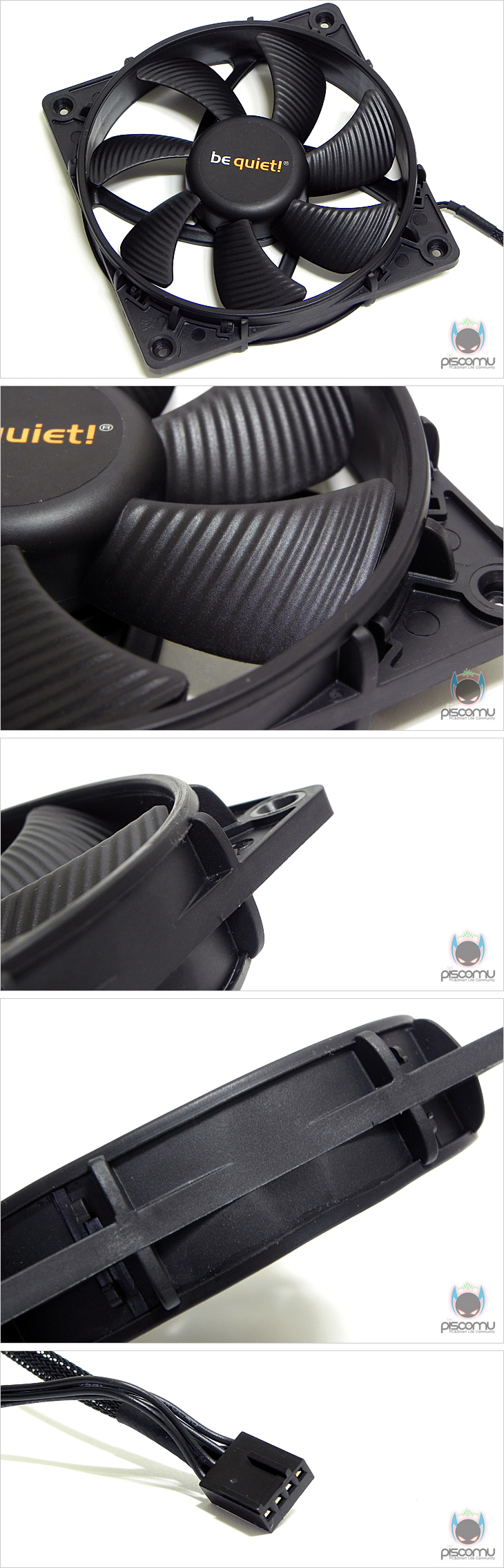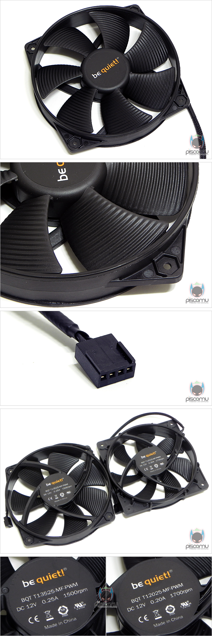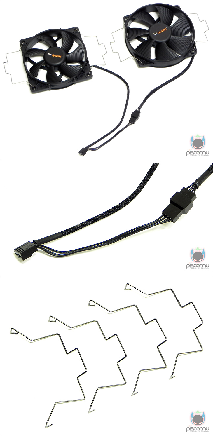 기본 제공되는 팬은 모두 앞에서 언급한 자사의 SilentWings 팬으로 먼저, 전면에 장착된 팬은 120mm로 날개(Blade) 전체에 결 무늬를 적용했습니다. 팬이 돌아가는 방향으로 결 무늬가 있어, 좀 더 많은 공기를 유입하기 위함으로 해석할 수 있겠습니다. 또한, 팬이 장착되는 각 모서리 부분은 베젤 전체에 적용한 것이 아닌 두께의 가운데 부분만 적용했으며, 배질 양쪽 외곽 재질은 고무(Rubber) 재질로 팬 작동시 진동방진 효과를 가져오게 했습니다. 팬 연결 작동방식은 PWM 방식이 되겠습니다. 가운데 장착되는 팬은 135mm 크기로 역시 날개(Blade)에 결 무늬를 적용했습니다. 팬의 원형은 135mm 크기를 가졌지만, 장착되는 규격은 120mm로 역시 각 모서리 장착 부위를 두께의 가운데 부분만 적용해 슬림하게 처리했으며, 역시 베젤 양쪽 외곽부분은 고무재질이 되겠습니다. 그리고, 팬 연결작동방식도 PWM으로 전면 팬과 동일하겠습니다. 두 팬의 후면은 통해서는 각 팬의 최대 속도를 확인할 수 있는데, 135mm 팬(Fan)은 1500RPM, 120mm 팬은 1700RPM)을 가졌습니다.