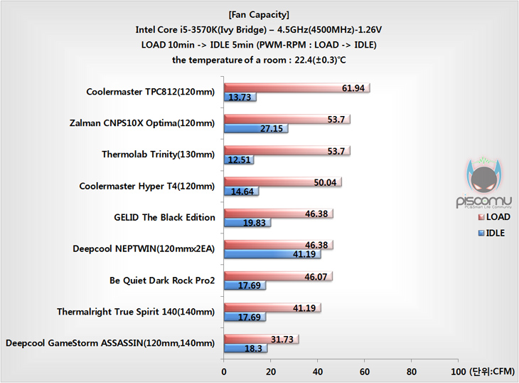 팬 소음은 앞에 속도와는 약간 반비례로 LOAD, IDLE 모두 정숙한 소음을 보여줬는데, 특히 IDLE은 저소음 수준으로 보여줬습니다. 전체적으로 소음이 낮게 발생된 이유는 역시 제공되는 자사의 팬 SilentWings의 특성인 베젤 부분이 고무로 처리되었기에 팬의 진동 소음을 잡아준다 할 수 있겠습니다. 끝으로, 쿨러 후면으로 빠지는 팬의 풍량을 120x120 규모에서 측정해 보았는데, Dark Rock Pro2 경우 다른 트윈 타워형 쿨러와 비슷한 풍량대를 보여줬습니다. 역시 소음대비에서 본다면 풍량은 꽤 많은 편이라 할 수 있습니다. 그리고, 앞에 팬 성능(속도, 소음, 풍량)으로 봤을 때, 프로세서의 냉각 성능은 만족스러운 편이라 할 수 있겠습니다.