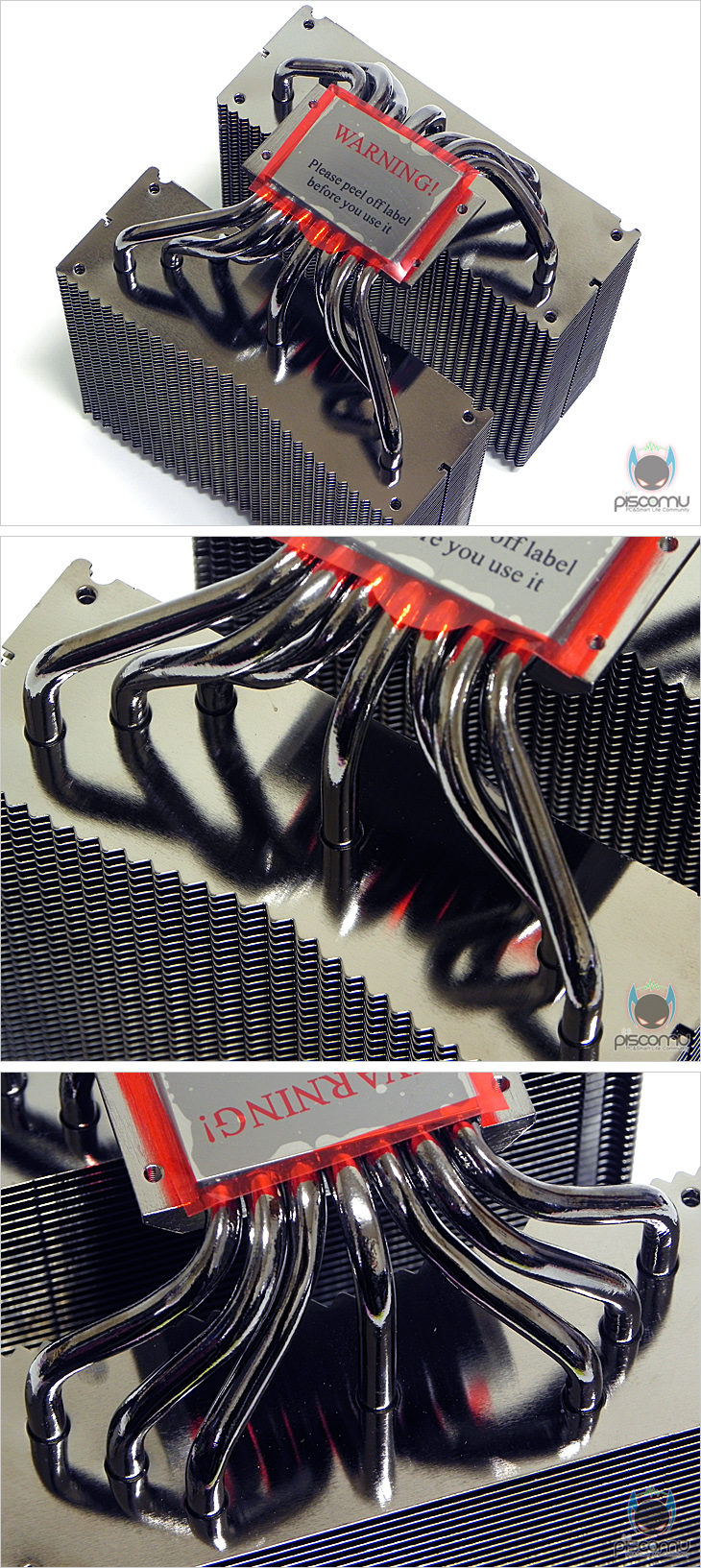 히트파이프는 지름 6mm로 총 7개가 적용되었으며, 앞서 구조에서 U자형 구조를 통해 14개의 효과를 가지도록 했습니다. 방열핀과 더불어 히트파이프 역시 블랙 니켈(Black-Nickel) 도금처리가 되어 있습니다. 또한, 앞부분과 뒷부분의 히트파이프 배치 형태가 뒤로 가는 화살표 방향 형태로 배치된 것을 확인할 수 있겠습니다. 그리고, 방열핀과의 접합식은 관통식이 되겠습니다. 끝으로, CPU와 맞닿는 베이스 부분 역시 블랙-니켈 도금처리로 사물이 비칠 정도의 매끄러운 래핑 처리와 함께 상당히 고급스러운 느낌을 주겠습니다.