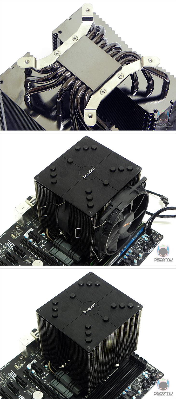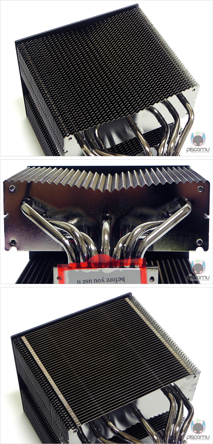 팬을 분리한 상태에서 쿨러만 좀 더 살펴보면, 거의 정사각형 형태를 갖추고 있으며, 쿨러 최상위는 역시 블랙에 아노다이징 공법의 표면 처리된 별도의 커버를 씌웠으며, 히트파이프의 마감처리 역시 커버를 씌웠습니다. 그리고, 커버 가운데는 제조사 로고(Logo)를 플레이트 형식으로 처리해놓았습니다. 커버를 분리하면 내부에 두 개로 나뉘어진 방열핀 형태 즉, 전형적인 트윈 타워형 쿨러 구조를 좀 더 쉽게 확인할 수 있겠습니다. 쿨러를 전면에서 보면 히트파이프가 아래에서 위로 올라가면서 갈라지는 형태를 가지면서 방열핀을 통과하는 것을 볼 수 있으며, 측면에서 보면 양쪽 두 개의 방열핀을 U자형 구조로 통과하는 형태임을 확인할 수 있습니다.