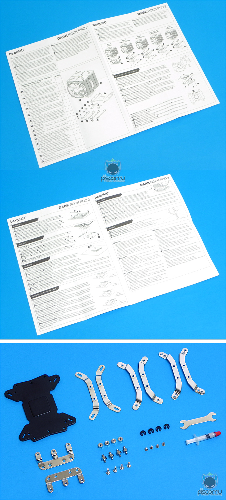 이제, Dark Rock Pro2를 사용해보겠습니다. 일단, 장착부터 하는데, 장착은 제공되는 가이드를 참고하면 어렵지 않게 할 수 있으며, 홈페이지를 통해서도 가이드를 다운로드 받을 수 있겠습니다. 일단, 공용 백플레이트에 자신의 프로세서 소켓에 맞춰 볼트 설정을 해줍니다. 그 다음은 고정와셔를 사용해 메인보드와 결합을 해줍니다. 조금 특이한 점은, 백플레이트가 일반 쿨러들처럼 수직이 아닌 수평으로 장착된다라는 점입니다. 따라서, 메인보드 후면 특징에 따라 간혹 장착 간섭이 발생할 수도 있겠습니다. 그 다음은 쿨러에 역시 자신의 프로세서 소켓에 맞춰 리텐션 플레이트를 장착해줍니다. 그리고, 그대로 쿨러와 메인보드를 결합해주면 기본적인 장착은 끝나며, 마무리로 다시 팬 클립을 사용해 팬을 장착해주면 되겠습니다. 장착에 있어 큰 어려움은 없겠습니다.