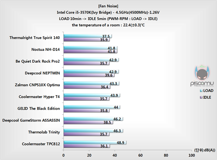 이제, NH-D14의 성능을 확인해보도록 하겠습니다. 시스템 기반은 인텔(Intel)이며, 프로세서는 i5-3570K로 트윈 타워형 쿨러이기 때문에, 바로 오버클럭(4.5GHz) 상황에서 진행되며, LOAD 10분 후 IDLE 5분으로 돌아가는 방향이 되겠습니다. 팬 소음 측정을 위해 VGA와 파워서플라이(PSU)는 팬이 없는 팬리스(Fanless)로 구성했습니다.