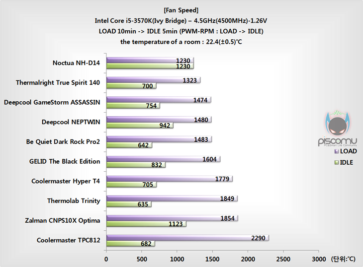 진행 동안의 제공되는 Y자 케이블로 연결된 두 팬의 속도는 두 팬의 최대 속도 범위에 근접하는 작동을 보여줬는데, 두 팬 모두 3핀 방식이라 별도의 속도조절 없이 일정하게 LOAD와 IDLE에서 작동이 되었습니다. 하지만, 속도는 비교모델들 중 가장 낮은 범위대(LOAD)가 되겠습니다.