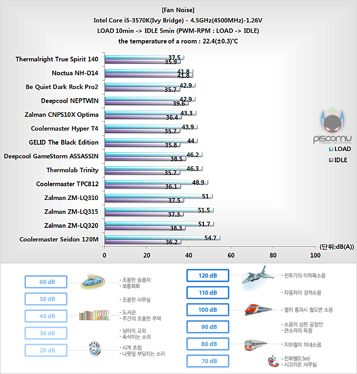 끝으로, 팬 소음 경우 역시 앞서 상위 두 모델과 마찬가지로 동일한 팬이기에 소음 결과도 차이가 있지만, 크지 않아 비슷한 결과대를 보여줬습니다. IDLE에선 정숙한 편이고, LOAD에선 다소 소음이 발생하지만, 거슬리지 않는 편입니다. 또한, 직접 케이스 안에 사용할 시에는 이보다 소음은 낮게 들리게 되겠습니다.