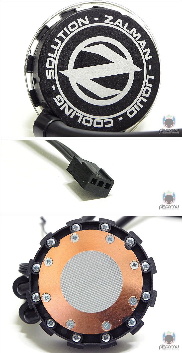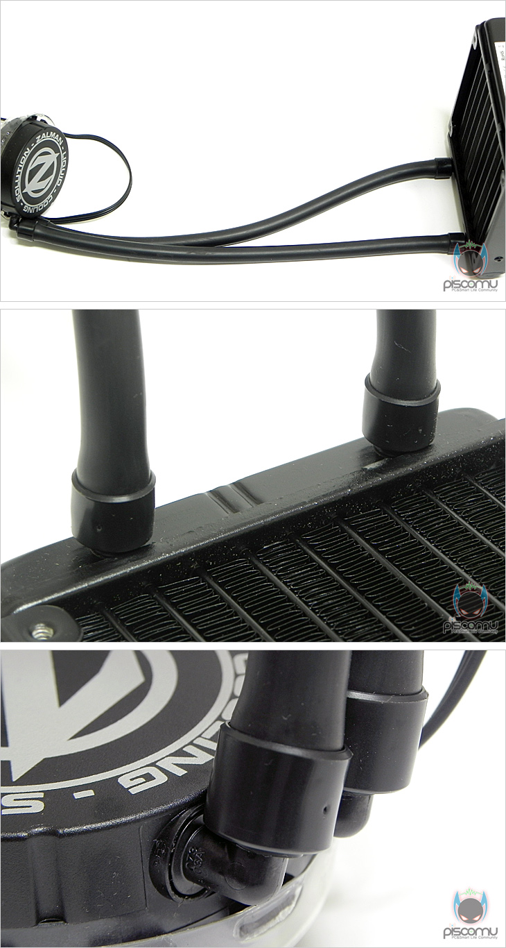 튜브 길이는 상위 두 모델과 마찬가지로 30cm 동일한 길이를 가졌으며, 고무재질로 역시 유연성을 가지고 있겠습니다. 또한, 라디에이터와 워터블록의 각 연결부 처리도 상위 모델과 동일하게 적용되어 누수 방지와 좌우 회전이 가능하겠습니다. 워터블록은 앞서 제품 박스에서 미리 확인했듯, 상위 두 모델에서 지원되던 블루LED가 미지원 되었습니다. 즉, 상위 커버의 엠블렘 디자인을 동일하나 표면에 인쇄 처리된 형태가 되겠습니다. 펌프 전원 연결방식은 3핀 방식이 되겠습니다. 하지만, CPU와 맞닿는 베이스 부분은 상위 모델들과 동일하게 구리재질 그대로, 가운데는 기본 써멀컴파운드가 도포되어 있겠습니다. 물론, 내부 마이크로 핀 배열도 동일한 적용입니다. 기본 제공되는 팬 역시 120mm 팬으로 상위 모델들과 동일한 팬으로 팬 속도 범위도 900~2000RPM으로 동일하겠으며, 연결 작동방식도 PWM방식으로 동일하겠습니다.