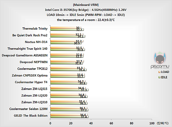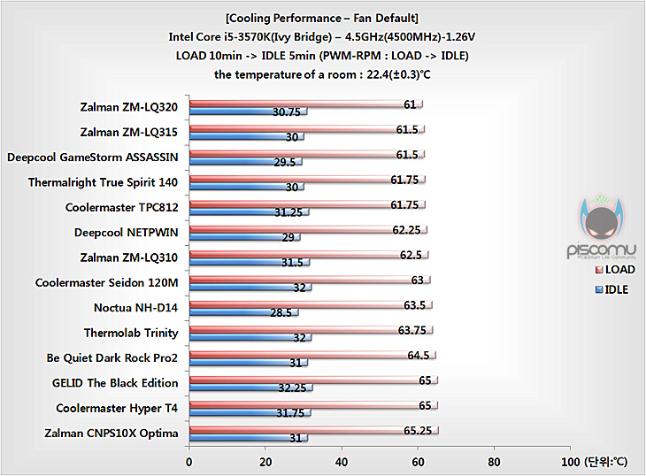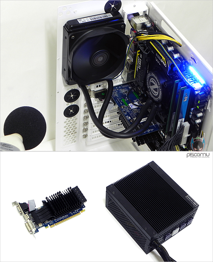 이제, ZM-LQ310의 프로세서 냉각 성능을 확인해보겠습니다. 시스템 기반은 인텔 아이비 브릿지 i5-3570K이며, 바로 오버클럭(4.5GHz) 상황에서 진행이 되겠습니다. 프로세서 냉각 성능을 시작으로 전원부 쿨링 영향, 팬 속도와 소음을 확인하는 순으로 하겠으며, 소음 측정을 위해 그래픽카드와 파워서플라이는 팬리스(Fanless)로 구성했습니다.